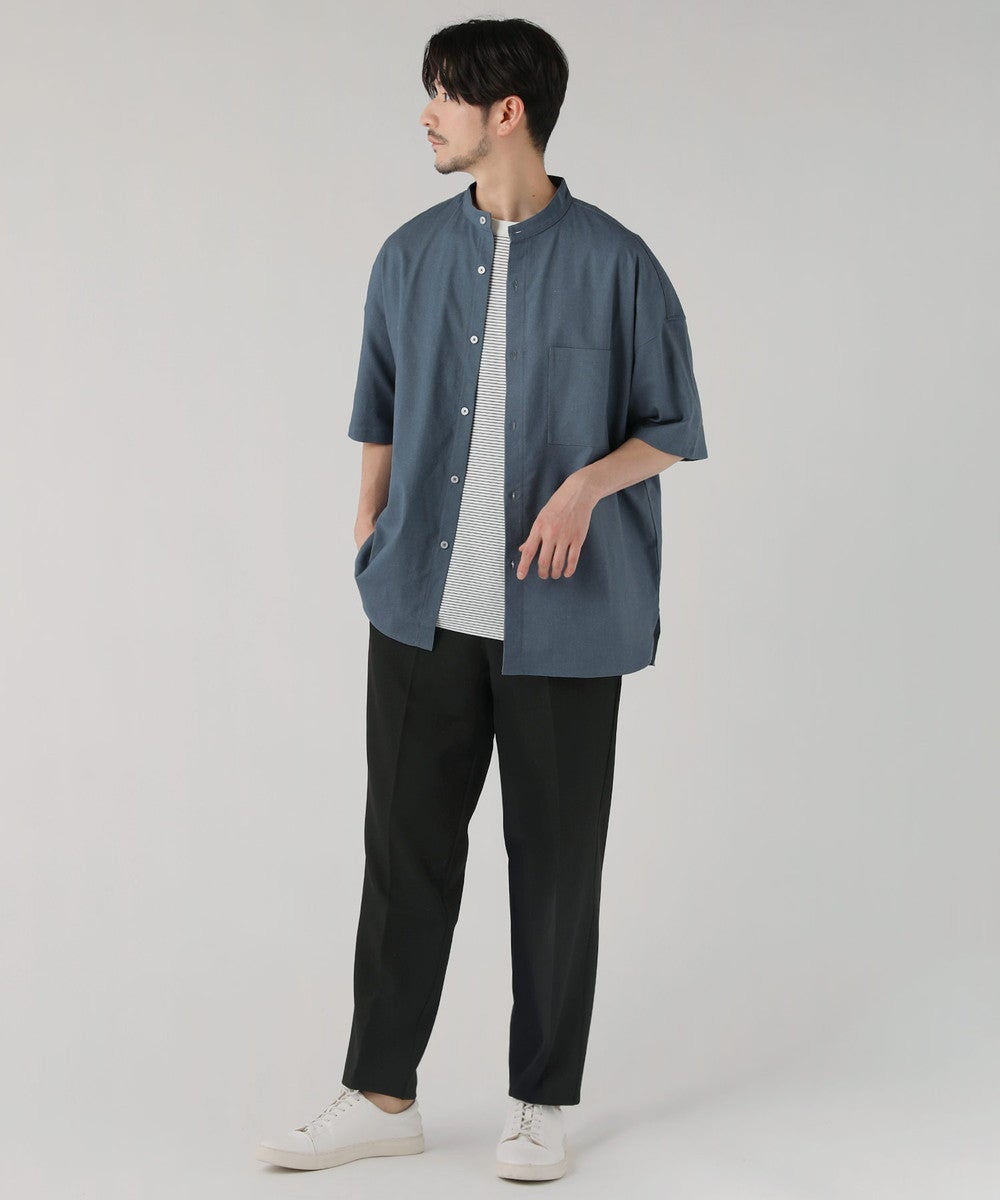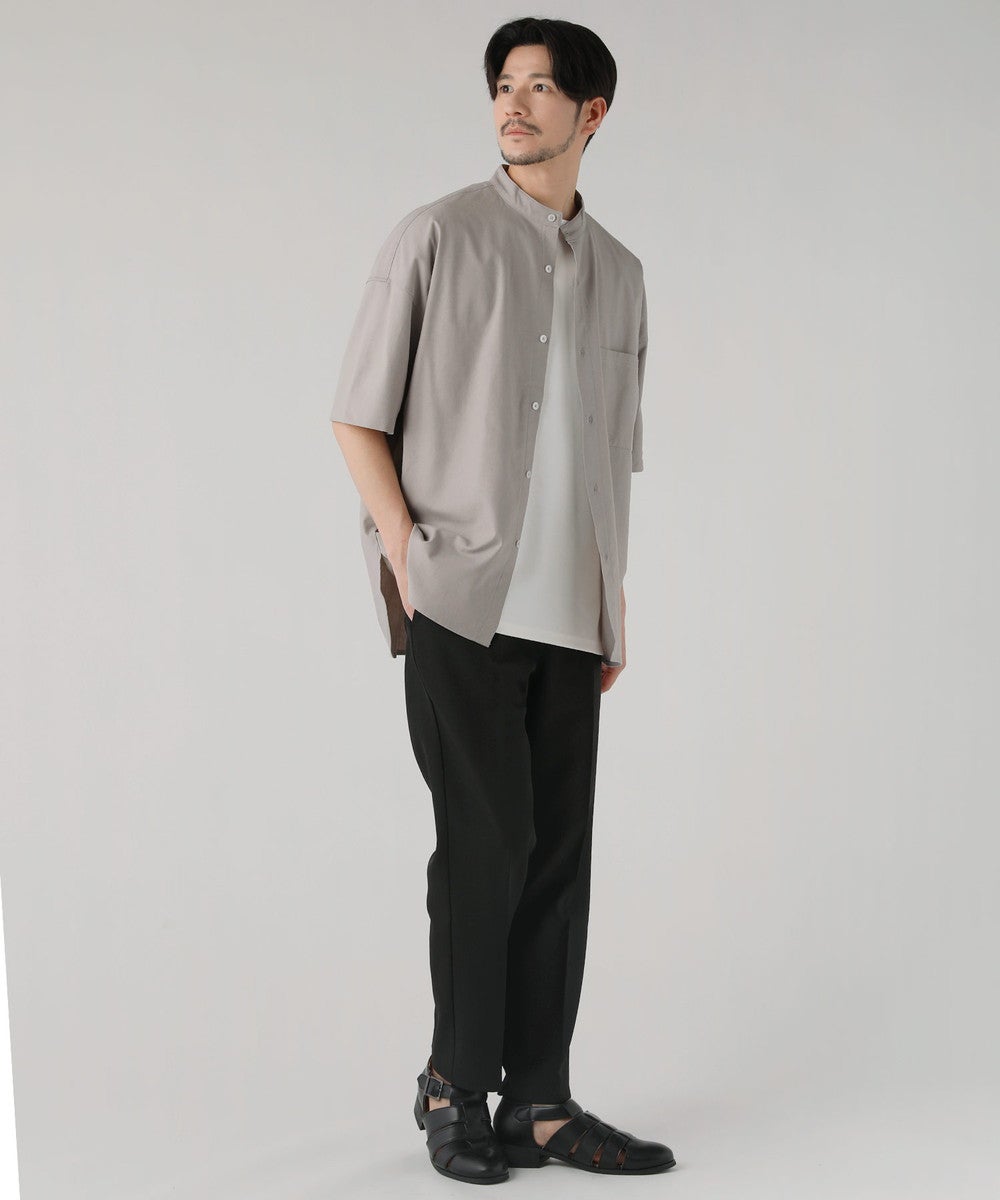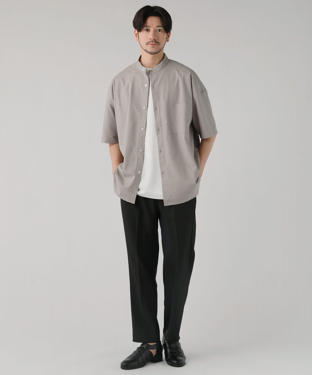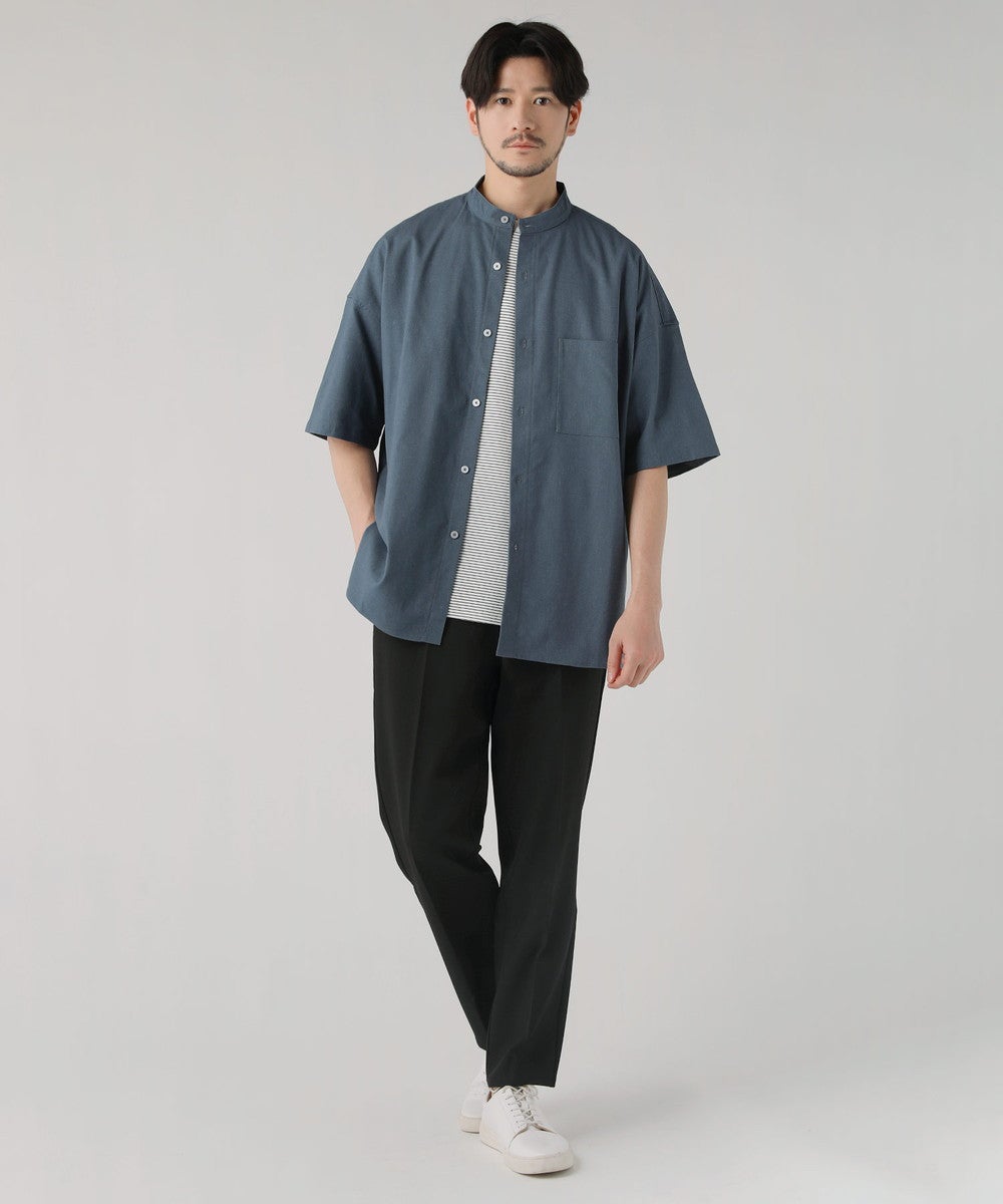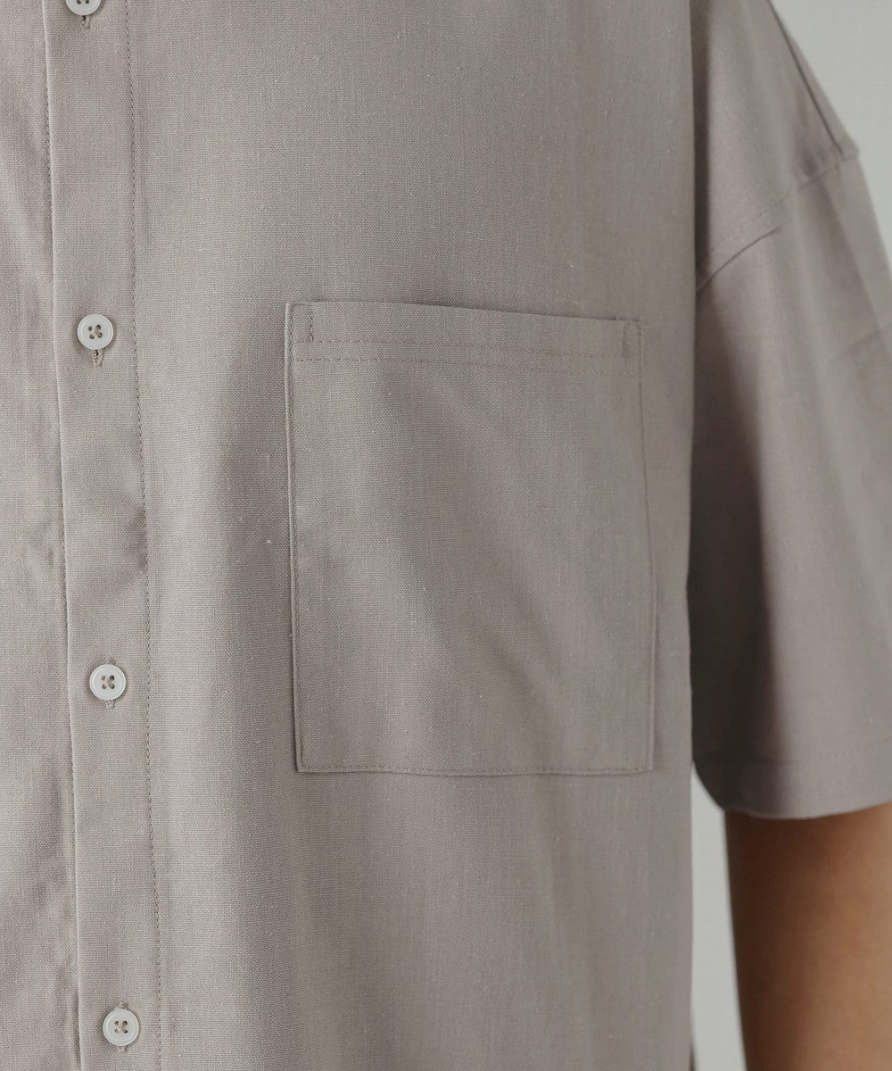 肘にかかる半袖の丈感、ゆとりのある身幅など、リラックス感のあるシルエットが特徴的。上襟のないバンドカラーは顔周りをシャープに見せるため、程よい品格をプラスしてくれます。左胸のポケットもアクセントに。丸みを帯びたラウンドヘムには前後差を出して、おしゃれ度をアップさせています。