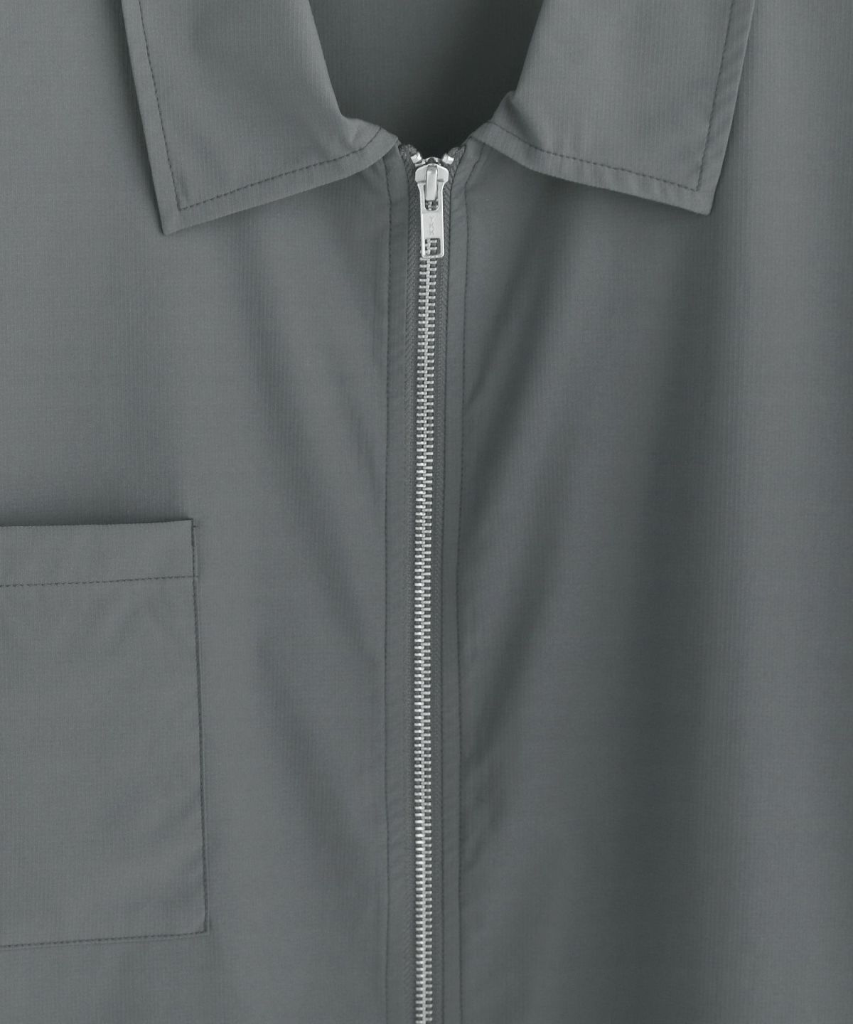 ジャケット感覚でアウターライクに着回せる半袖シャツです。フロントをボタンではなくジップアップにしたワークデザイン風のディテールと、身幅を大きく取ったルーズなサイズ感を活かして、こなれた大人の雰囲気を作り出します。生地は、ソフトな質感でありながらもシワになりにくい機能性素材『SOLOTEX(R)』を用いました。とても軽い着心地で、ちょっとした羽織り物としてぴったり。バッグに入れて持ち運んでも折り畳みによるシワが目立ちません。サッと着るだけでサマになるファッション性と快適な機能性を兼ね備えた、お得な一着です。 また、同素材のテーパードスラックスパンツもご用意しました。上下セットアップでご着用いただくことでバランスの取れたコーディネートが簡単に完成します。