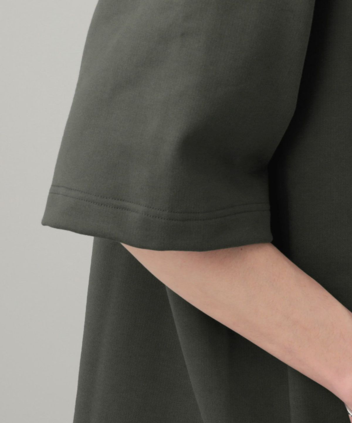 特殊なシルケット加工を施し、従来の裏毛よりも上品でハリとコシのある質感が特徴のヘビーウェイト素材を使用。毛羽の少ない糸を密度を詰めて編みたてることによって編み目が綺麗に揃い、滑らかな表面に仕上がりました。厚手でありながらも型崩れしにくく、イージーケアで日々のお手入れも簡単です。