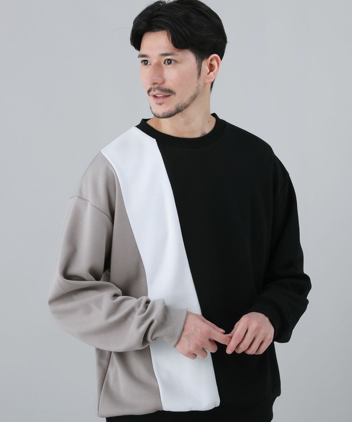 パッチワークのように三色の生地を切り替えたデザイン。シンプルながら存在感のある一枚でトレンドライクなこなれ感を演出できます。