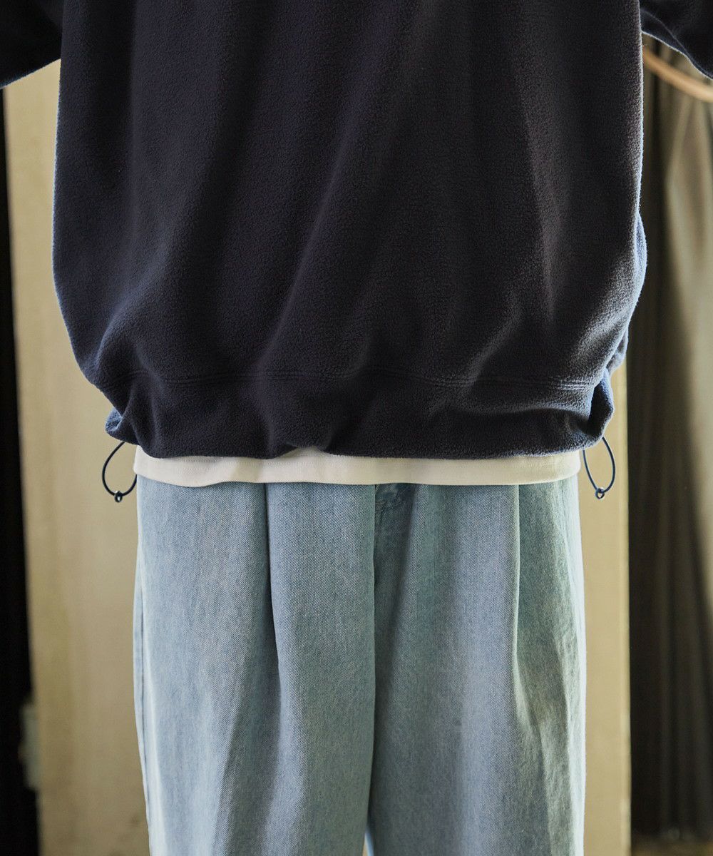 胸元にブランドネームを施しており、シンプルながらも洗練された印象を感じさせます。軽量のフリース生地を用いているためラフな着心地。サイズにゆとりを持たせているため程よいドレープが生まれ、コーディネートにリラックス感を与えます。