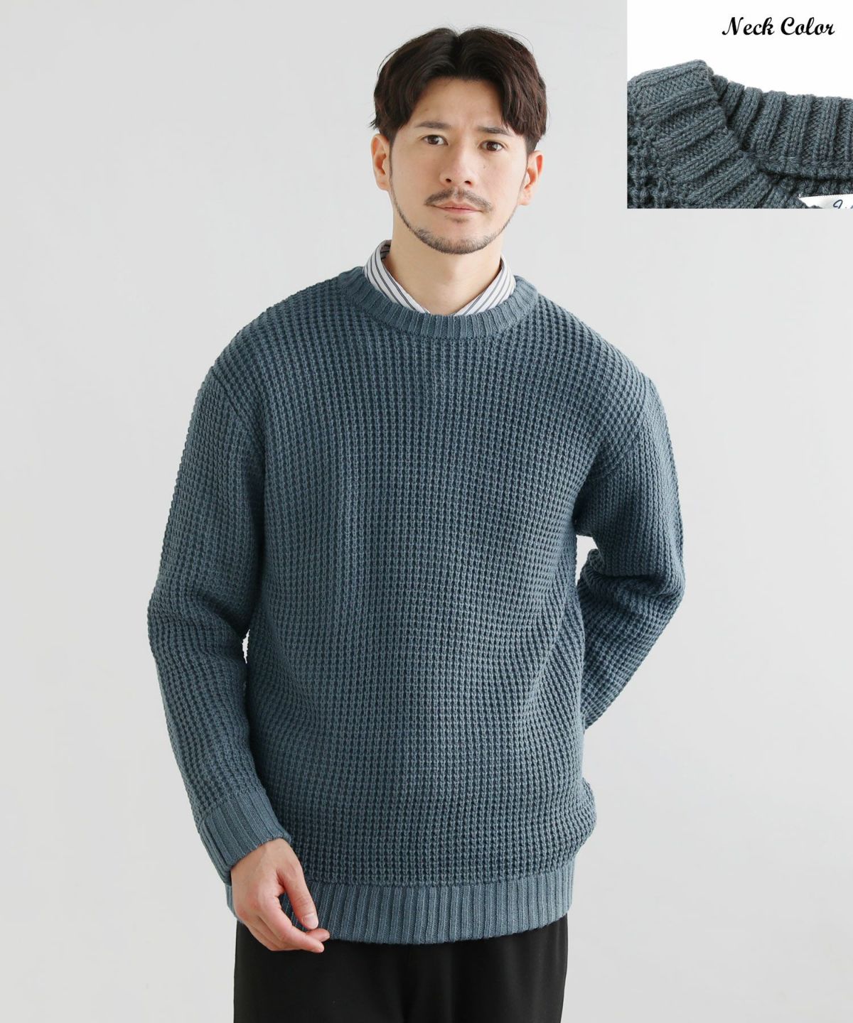 アンチピリングワッフル編みクルーネック長袖ニット