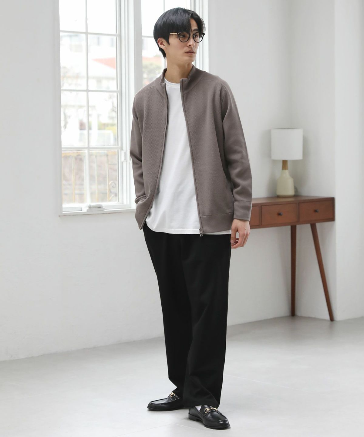 ピーチスキンポンチ/杢ポンチ ノーカラーカーディガン&テーパードパンツセットアップ