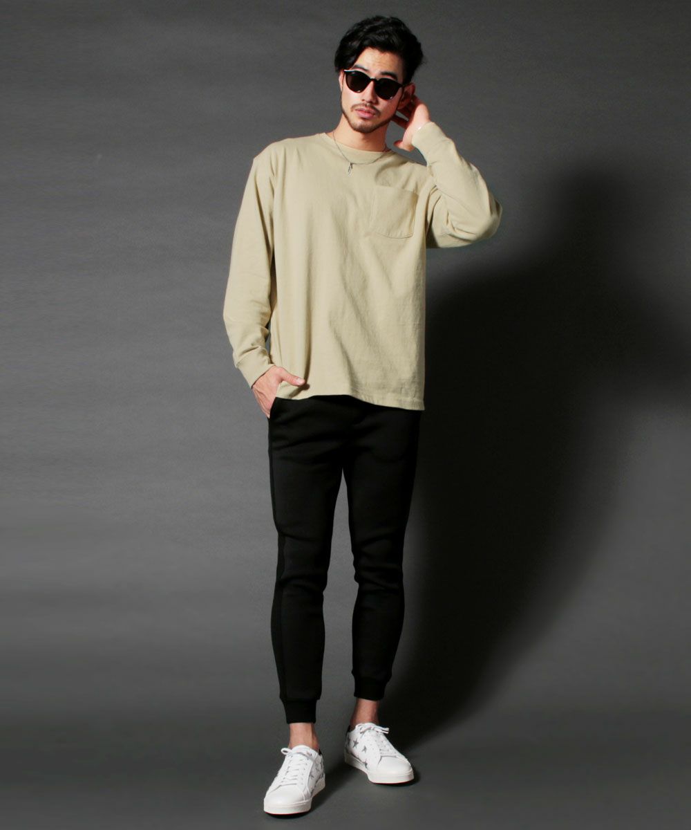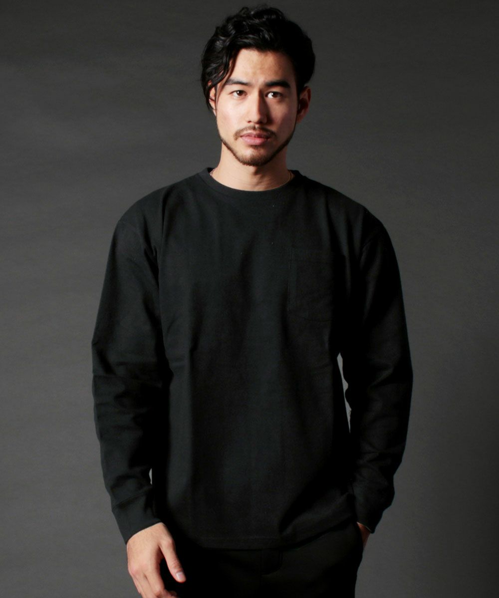 日本製吊り編み天竺ヘムラウンド胸ポケ付きクルーネック長袖Tee