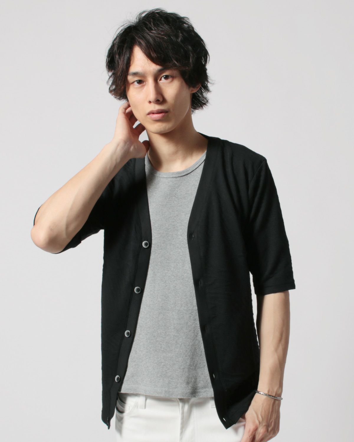 ふくれジャガード5分袖Vネックカーディガン