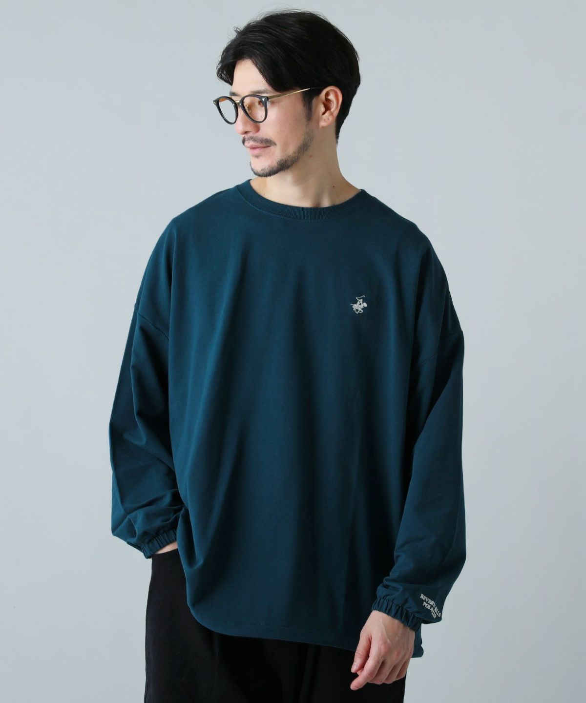 胸ロゴ刺繍裾ドローコード鹿の子ポンチハーフボタン長袖ポロシャツ