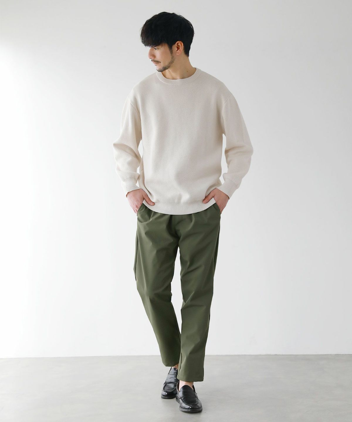 カーキやアイボリーといった中明度のボトムを合わせると今風のニュアンスカラーコーデが完成。白シャツとのレイヤードコーデや、セットアップのインナーとして合わせるなど、大人のキレイめスタイルとしての着用もおすすめです。