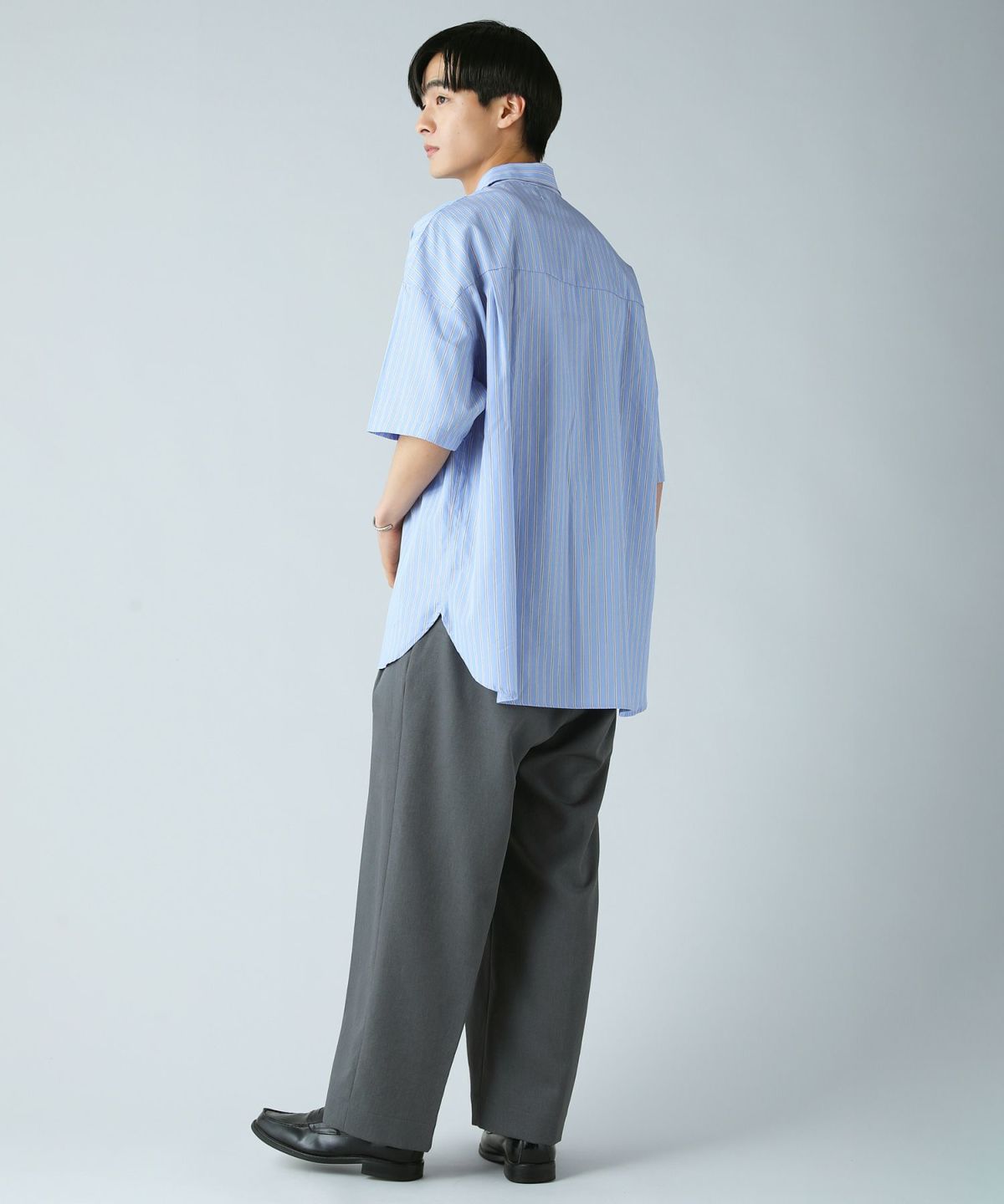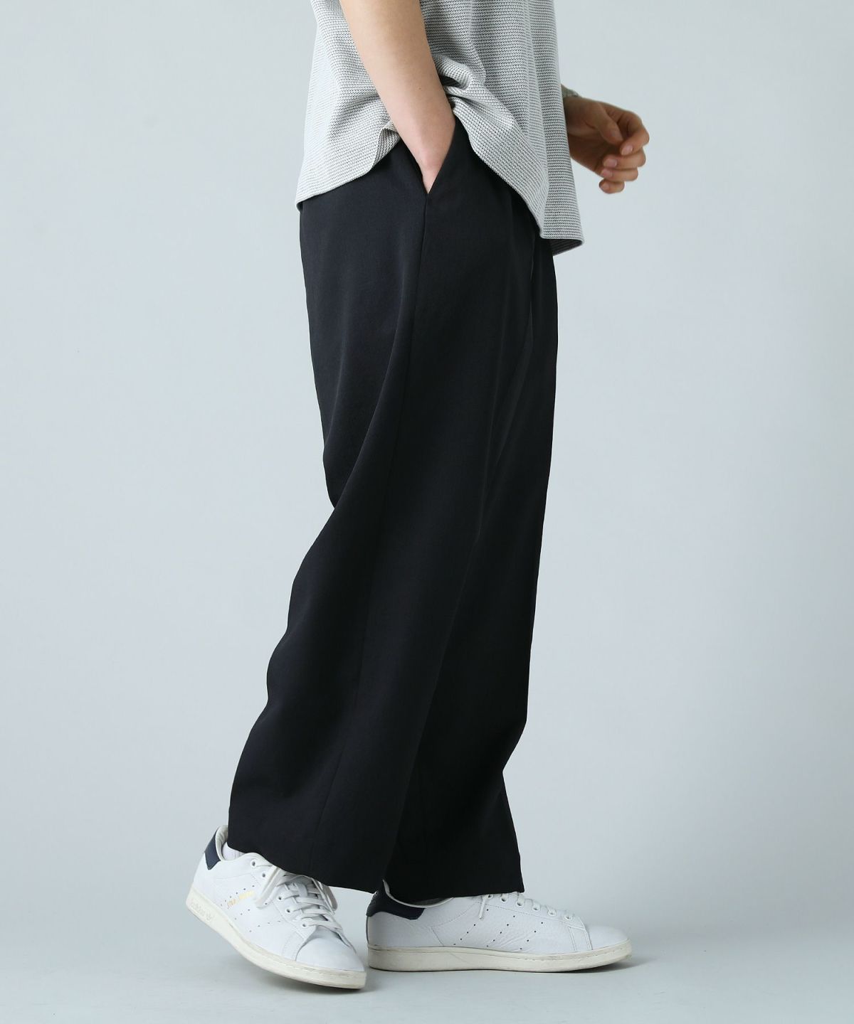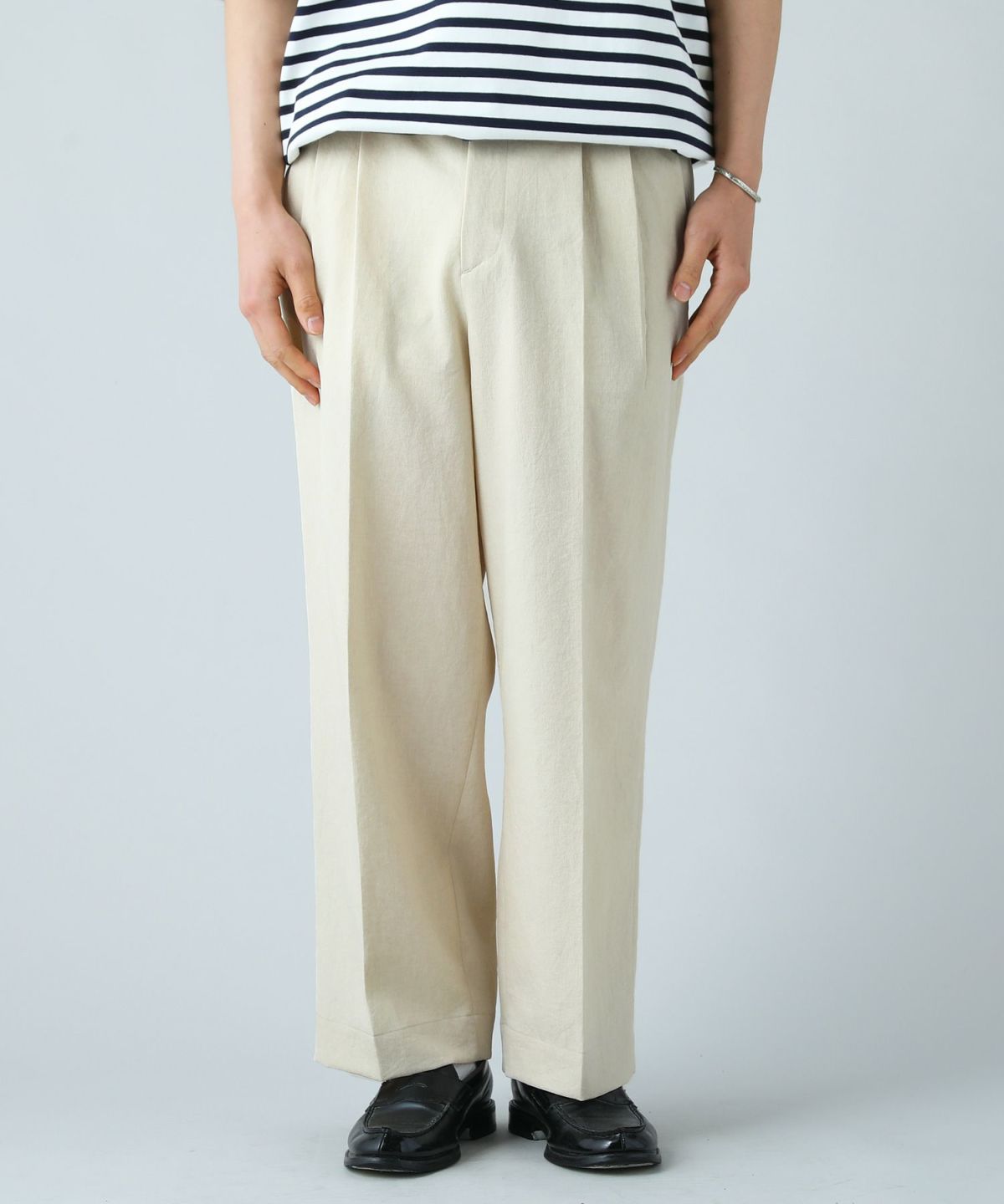ドライタッチなカルゼ生地を使用したスラックス。程よくテーパードしたワイドシルエットで、フロントにタックとセンタープレスを入れることでクラシカルな印象に。カジュアルからキレイめまで幅広いスタイルに合わせてやすく、ワイドパンツながら着回しやすさにこだわった快適な一着です。