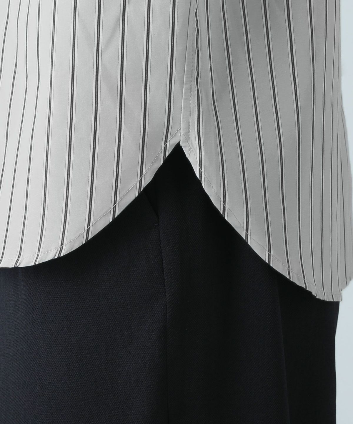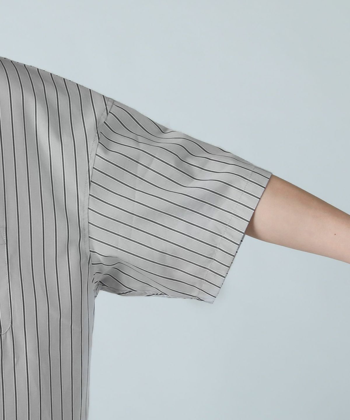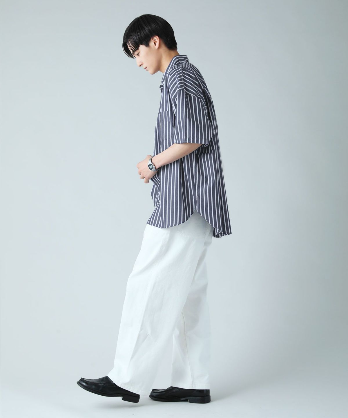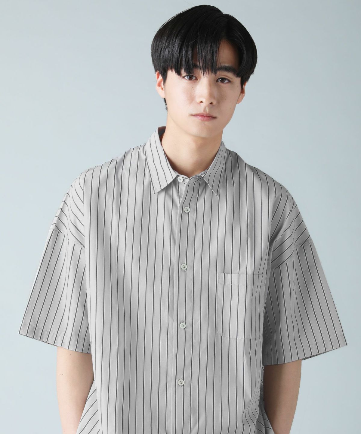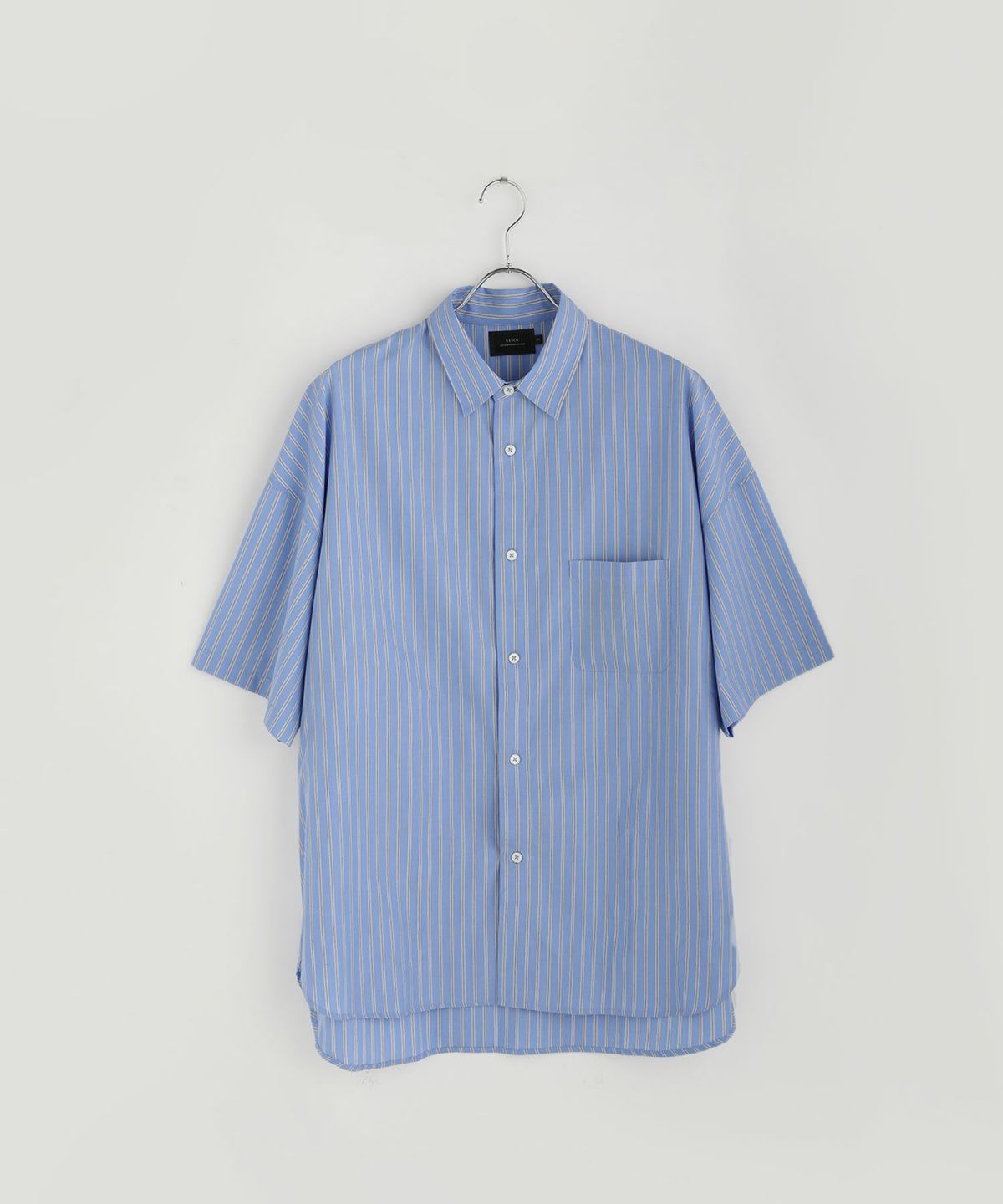 目の細かい高級感のある高密度のストライプ生地の素材感を生かすように削ぎ落とされたミニマルなデザインの半袖シャツ。 肩を落としたドロップショルダーデザインで、こなれ感たっぷりの雰囲気を作り出します。 丈夫になるよう脇の縫い目は折伏せ縫いに、さらに運針の細かなステッチを採用するなど、縫製にもこだわったアイテムです。