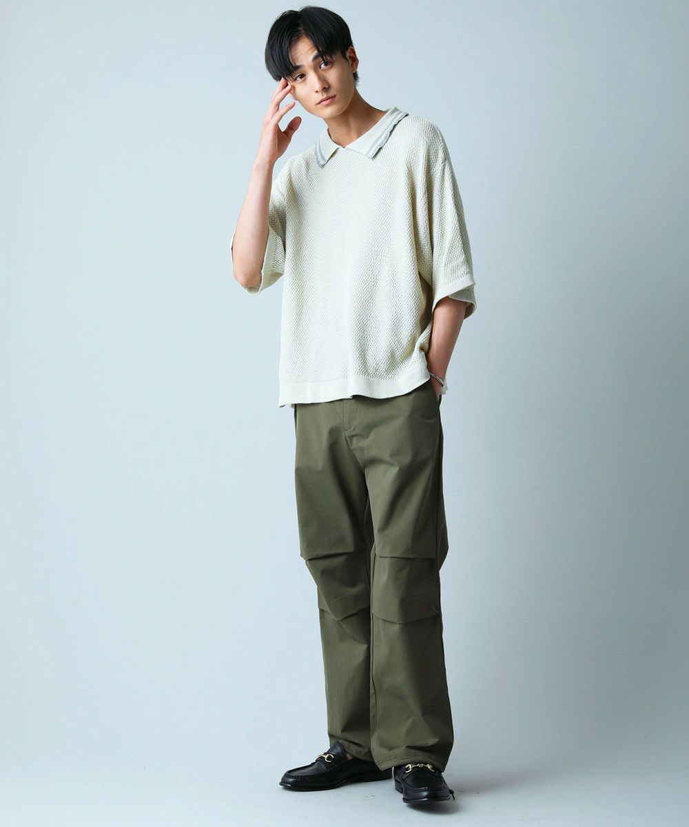 スラックスと合わせたクリーンな着こなしや、ラフにデニムやイージーパンツ、スニーカーを合わせた着こなしもおすすめ。ランダムなボーダー柄と首元の配色部分がアクセントとなる為、一枚着でも単調にならずおしゃれにまとまります。シンプルになりがちな夏の着こなしに新鮮さを与えてくれる一着です。