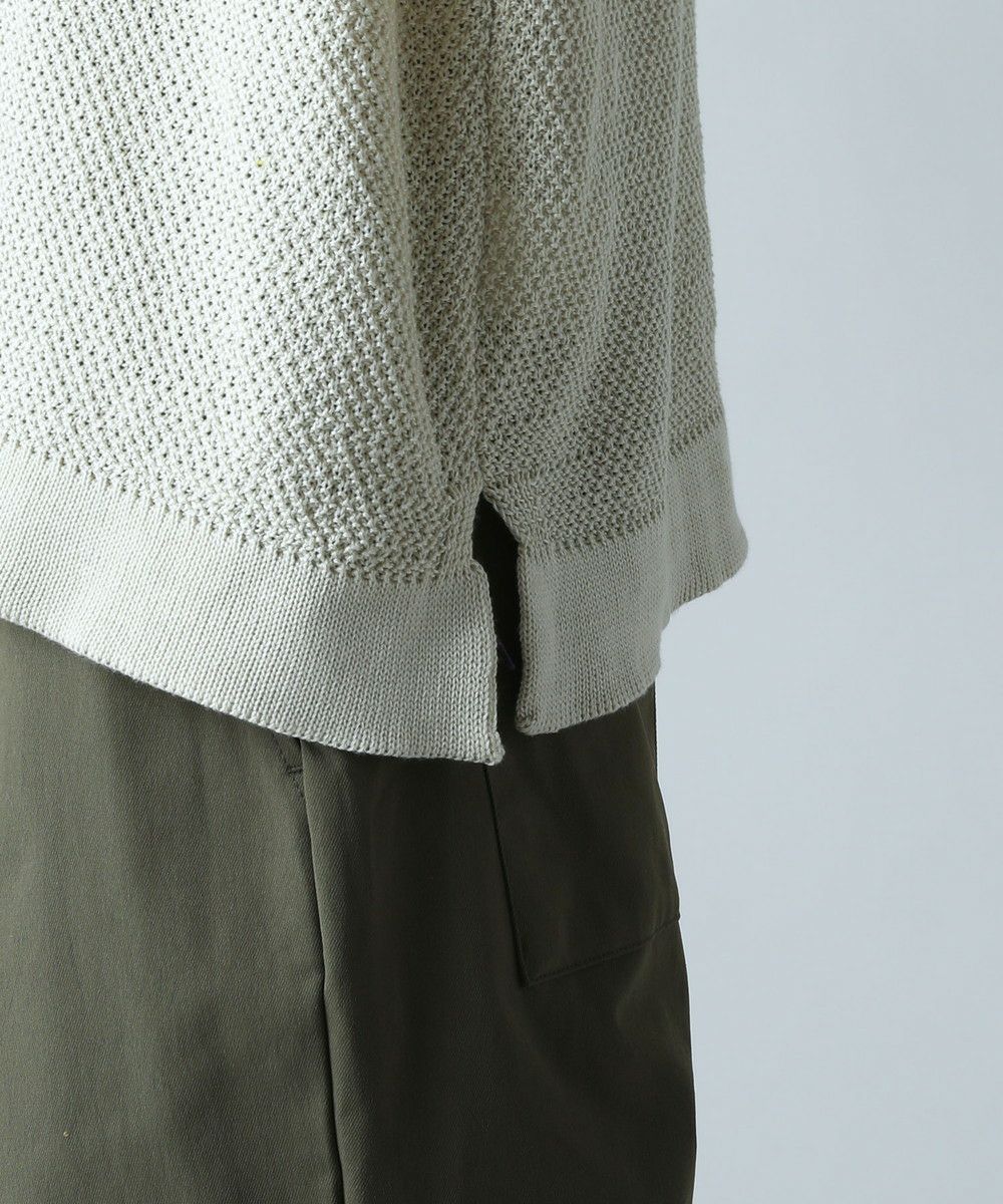 凹凸と透け感のある鹿の子編みニットを使用。表面のさり気ない凹凸と程よい透け感が、シーズンらしさと着たときに肌にまとわりつかない快適さを併せ持っています。ポリエステル100%でさらっとしたタッチと軽い着心地が特徴です。