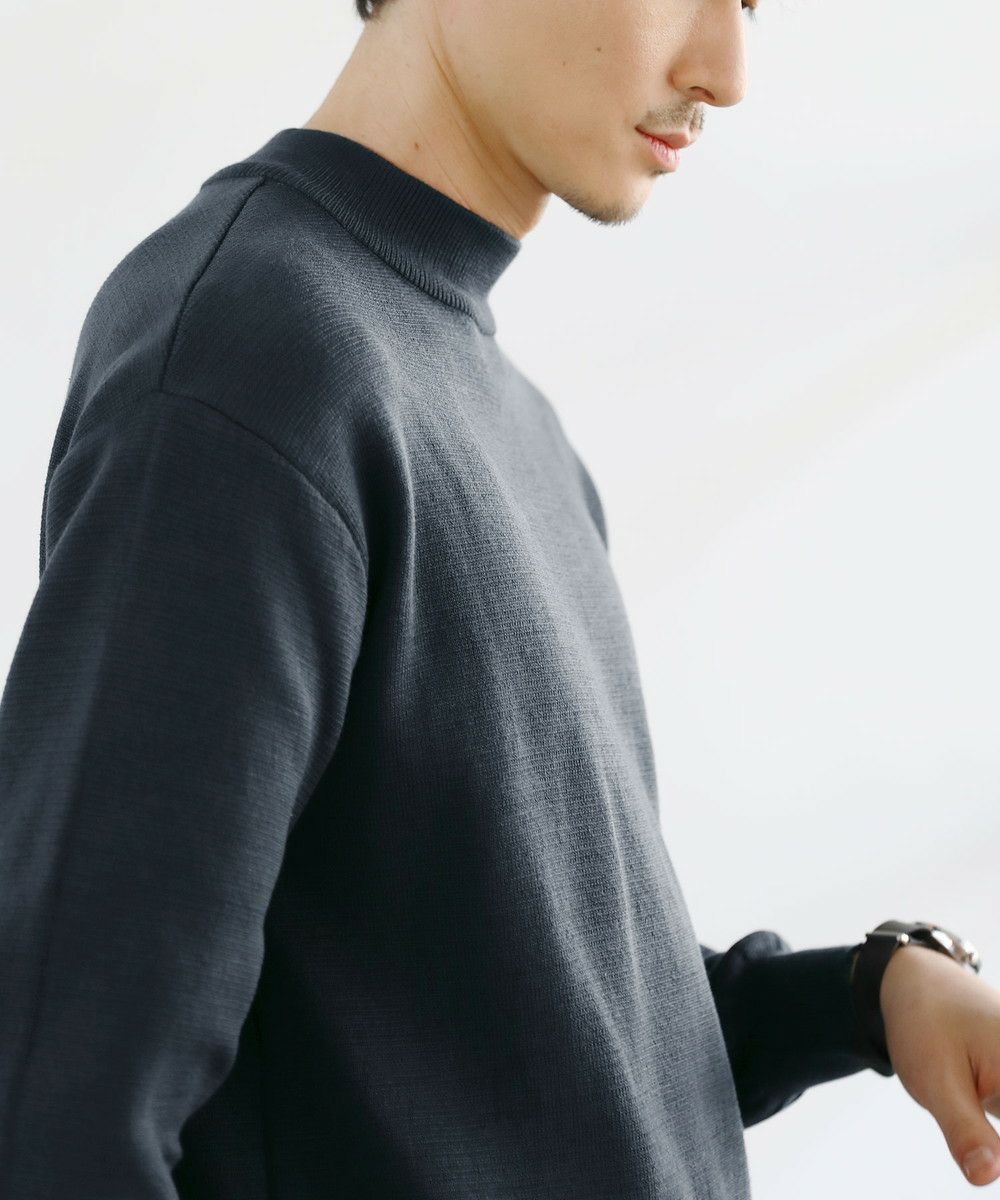 首元は折り返しの必要がないモックネック仕様。タートルネックほどボリューム感が出ず、アウターを重ねた際の首元のバランスをとってくれます。コンパクトな作りなので上からジャケットを羽織ってもごわつきにくく、秋口から春先にかけてお楽しみいただけます。