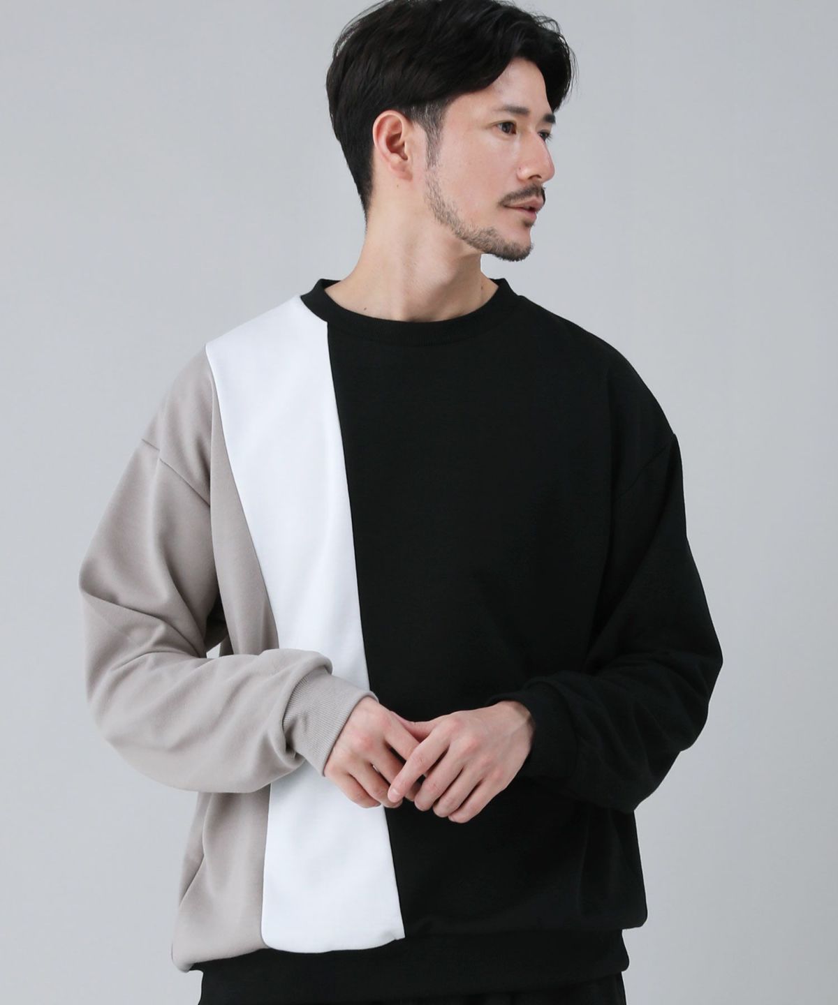 パッチワークのように三色の生地を切り替えたデザイン。シンプルながら存在感のある一枚でトレンドライクなこなれ感を演出できます。