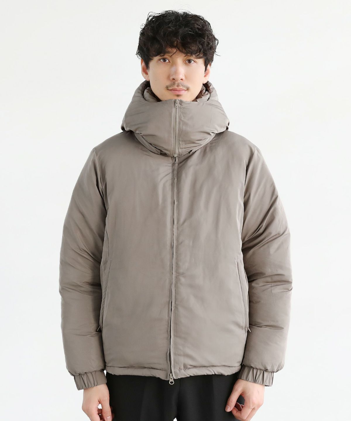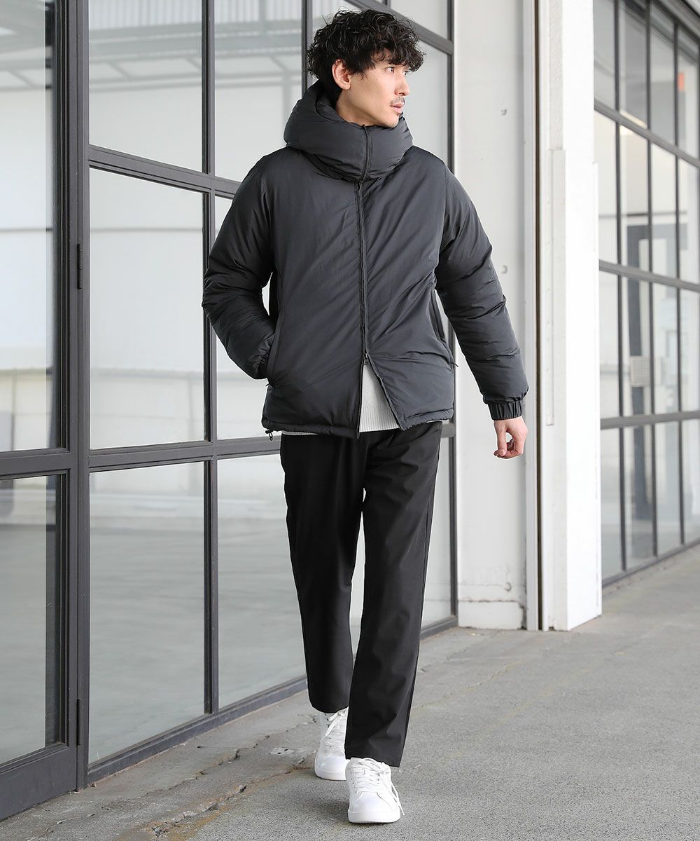表側に中綿袋のもこもこ感を出さないシームレスデザインですっきりとした印象にまとめています。さらに脇の部分だけを身頃とは別パーツで縫い合わせるパターンにすることで着用時のウエスト周りの着ぶくれ感が抑えられるように設計。中綿入りでありながらもスマートに見えるシルエットを実現させました。細身に感じられますが、内側には 厚手のケーブルニット を着用できるほどのゆとりがあります。