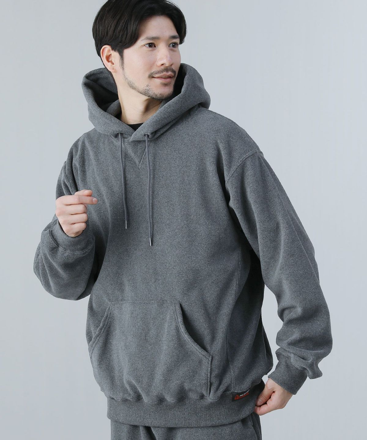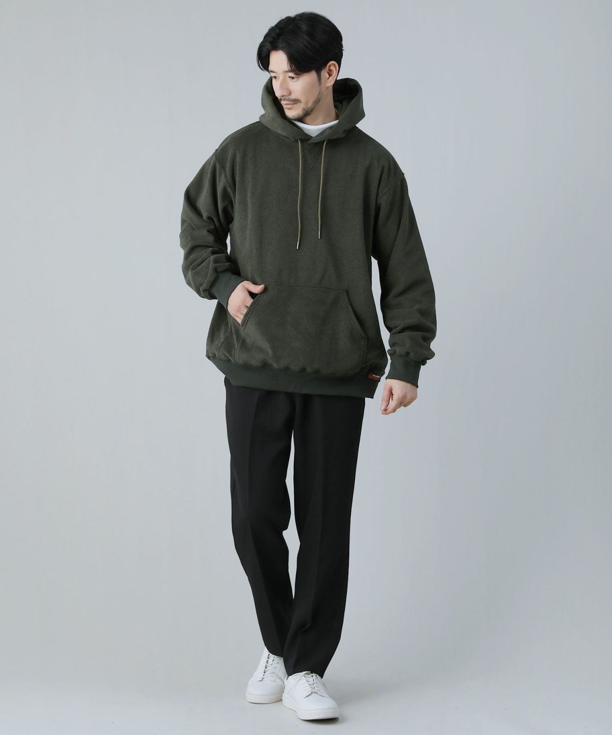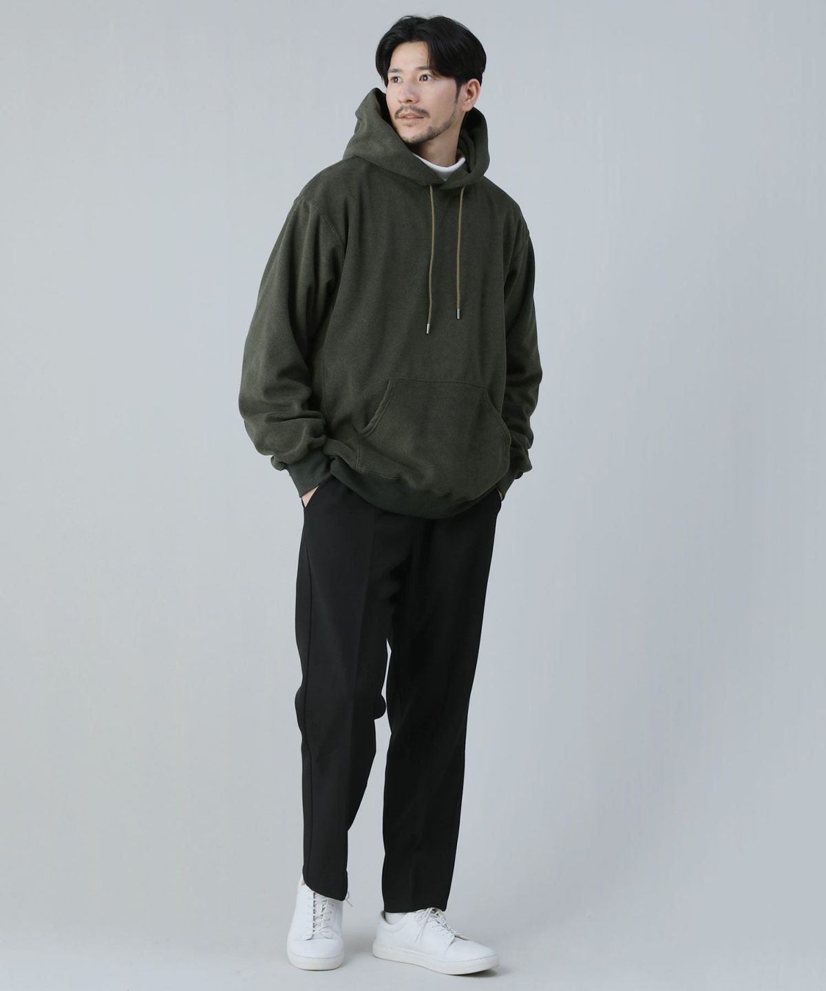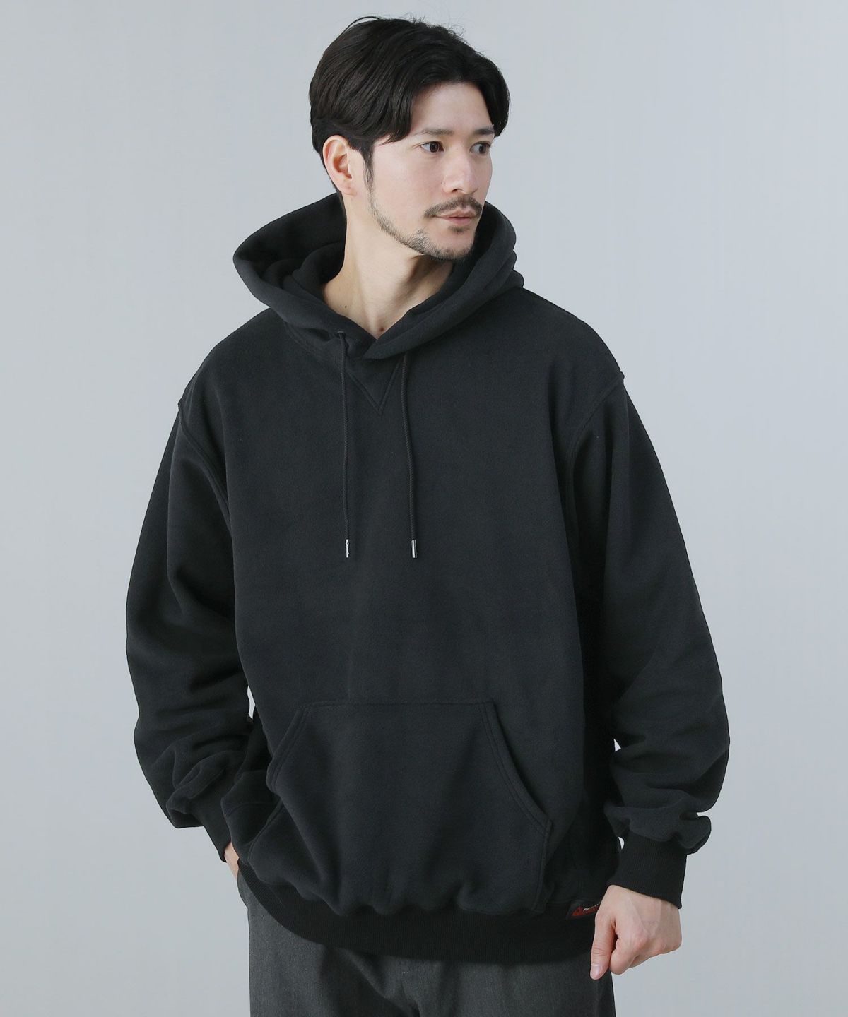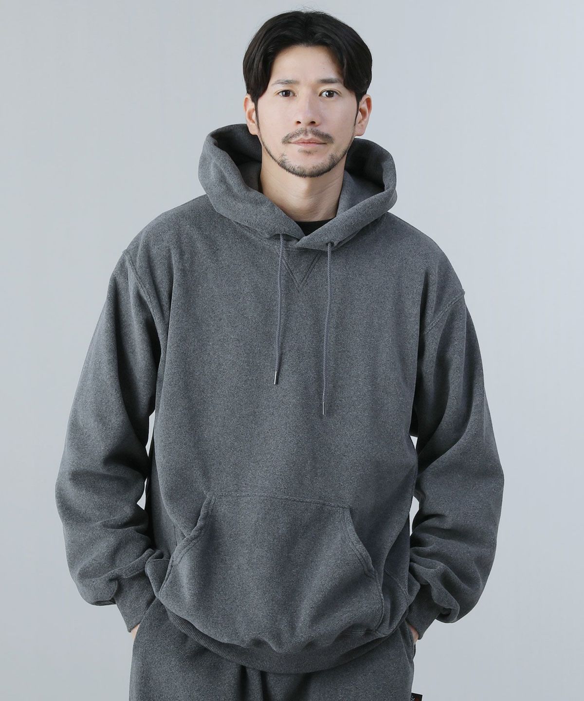 サイズはゆったりとリラックス感のあるドロップショルダーデザインで、ストレスフリーな着心地がポイントに。首元に取り付けられた三角ガゼットと存在感のあるカンガルーポケット付きで、フード部分のバランスとメタルチップを使用したスピンドルがスタイリッシュな印象を生み出します。