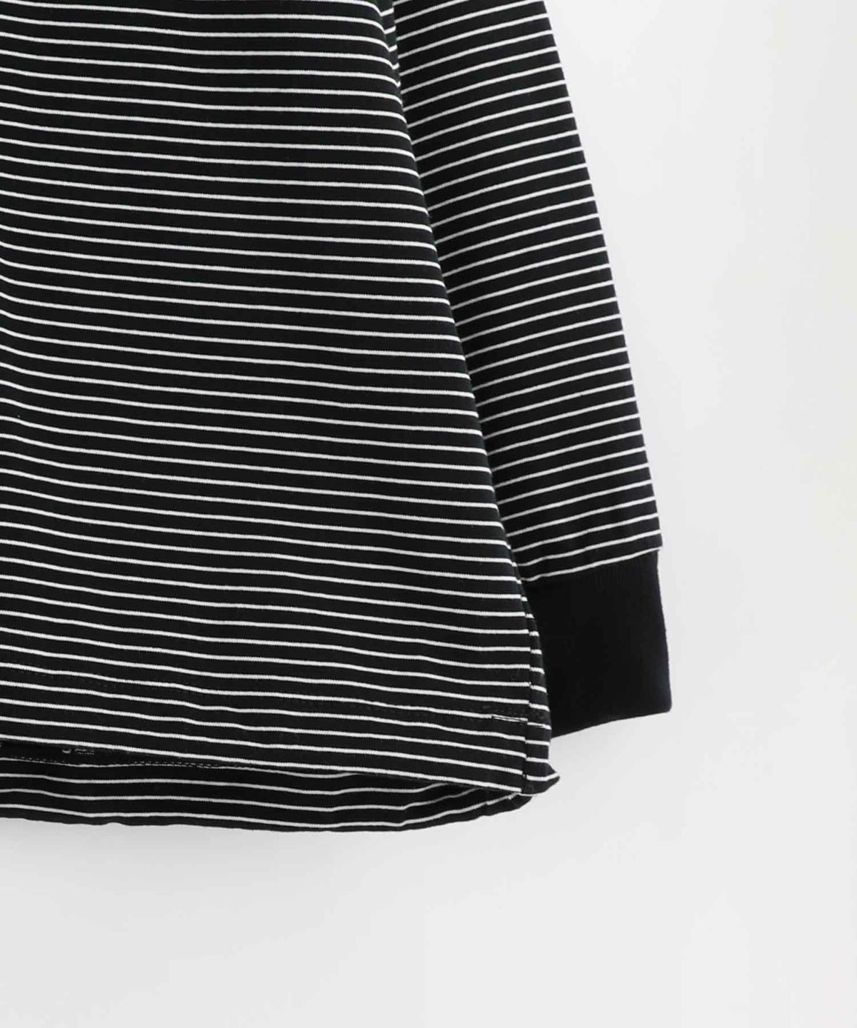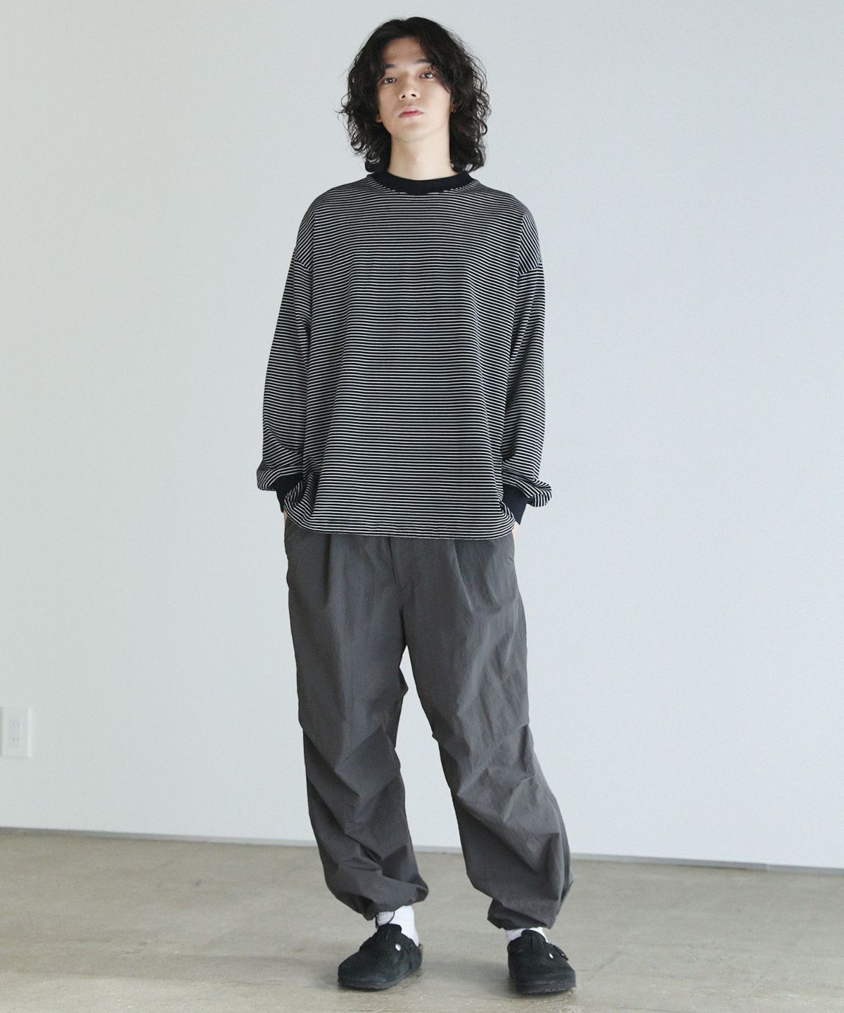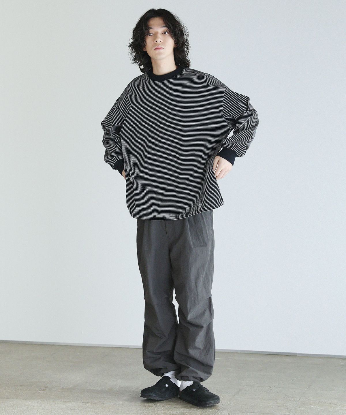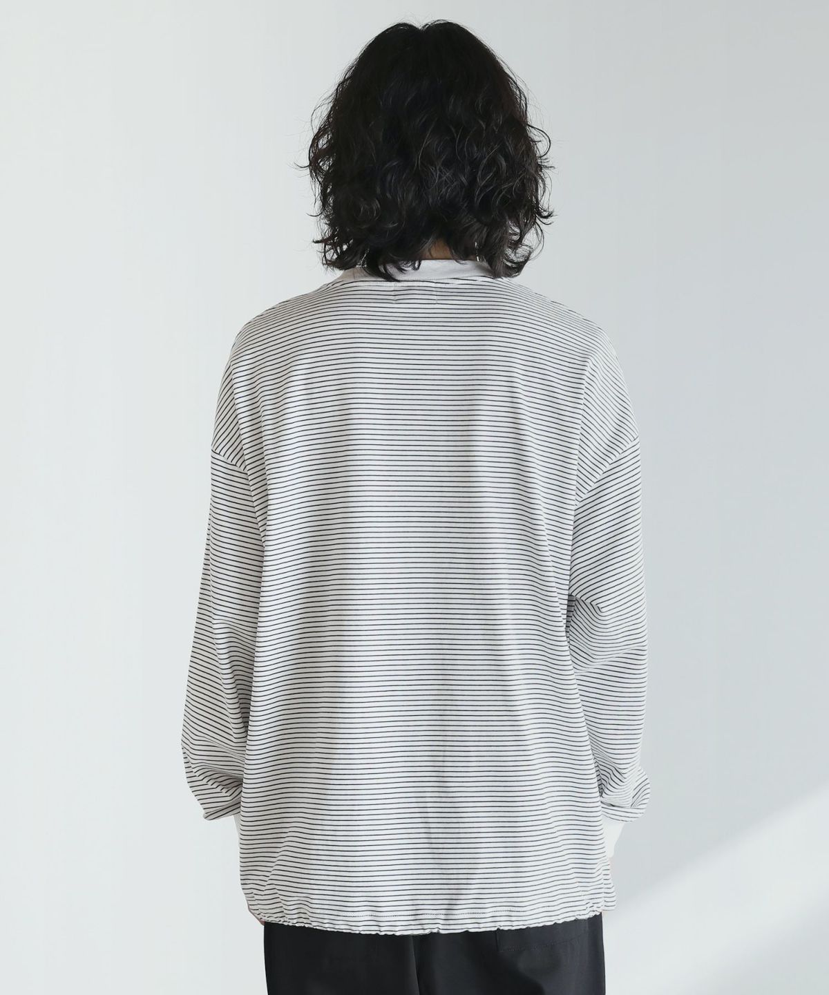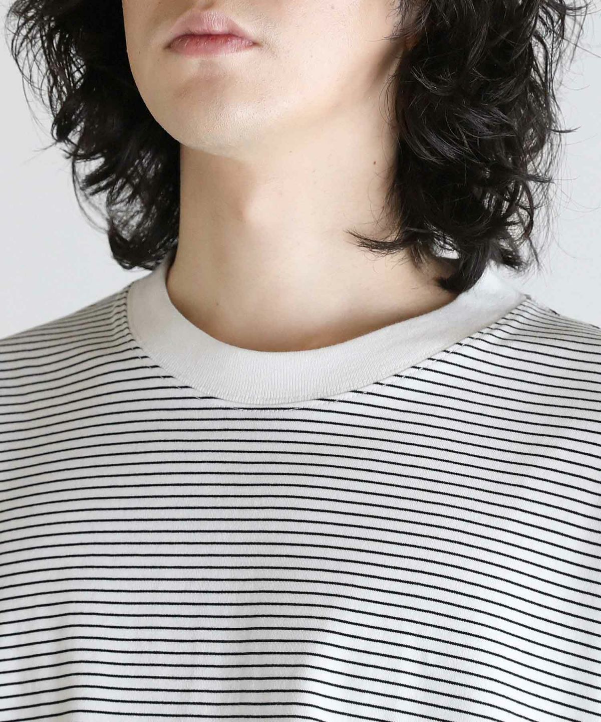 マイクロボーダー天竺を採用した、ドローストリングスTシャツ。 肩の落ちたドロップショルダーと広めの身幅を取ったデザインで、ゆったりとした着心地ながらおしゃれに決まる一着。 細かいピッチのボーダー柄と落ち着いたトーンの配色で、程よいアクセントがありつつクリーンな印象にまとまります。