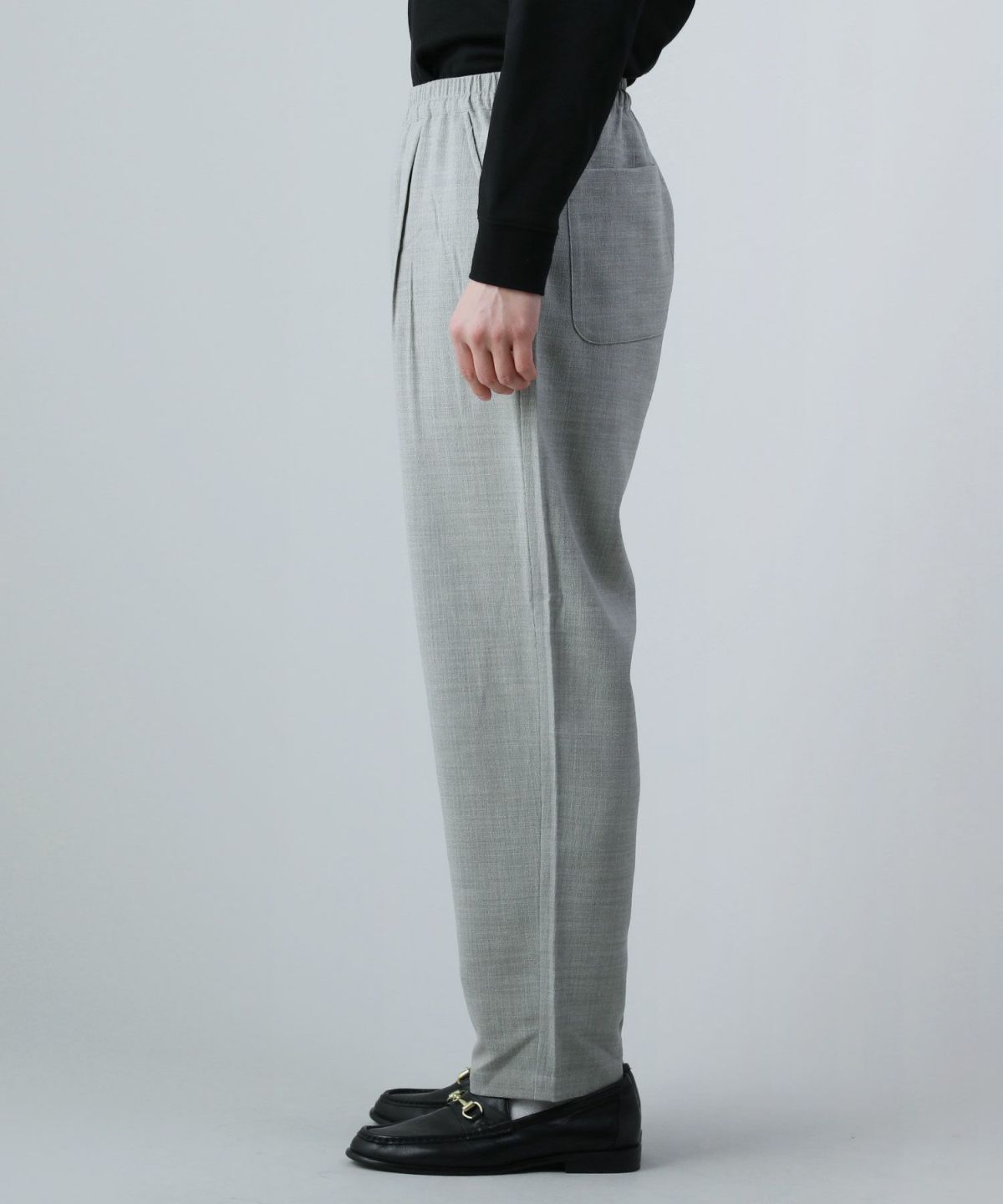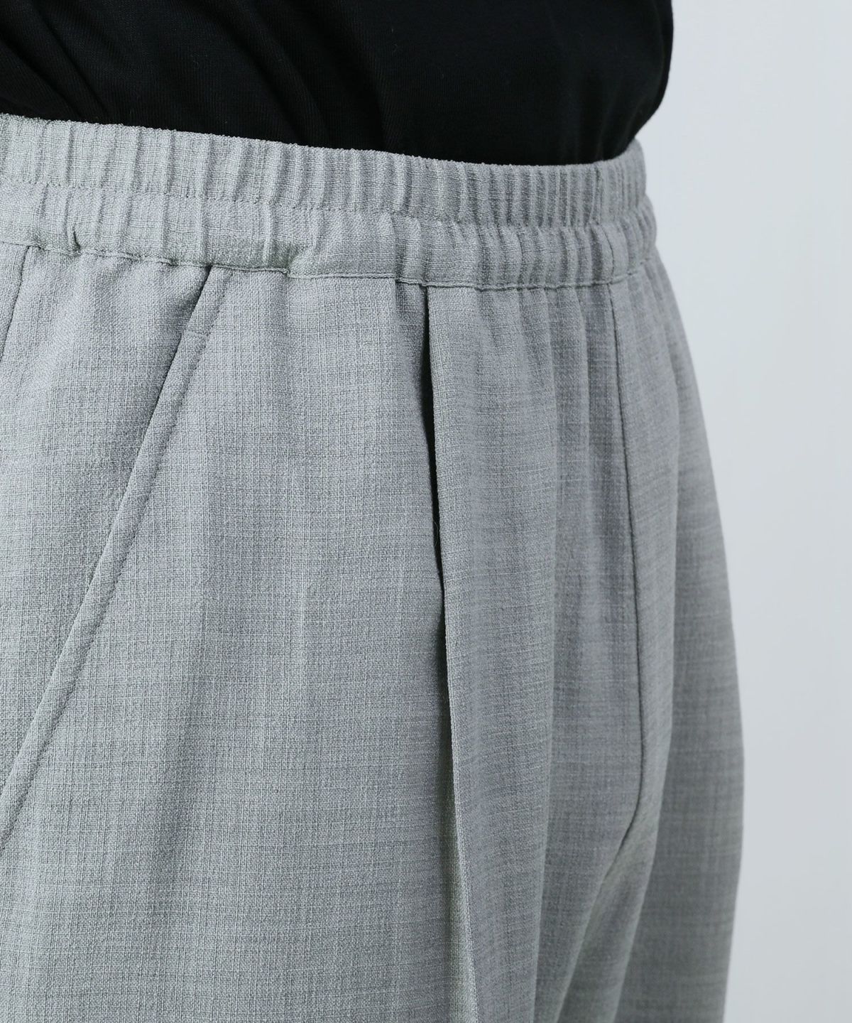 ウエストはゴムと紐の2つを採用し、腰回りに優しくフィットしながら紐を用いての細かいサイズ調整が可能。リラックス感のあるシルエットで脚のラインを拾いすぎず、抜け感のある印象をプラスします。
