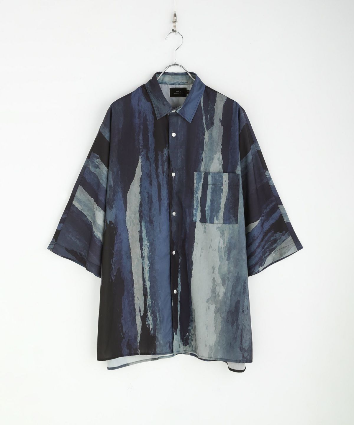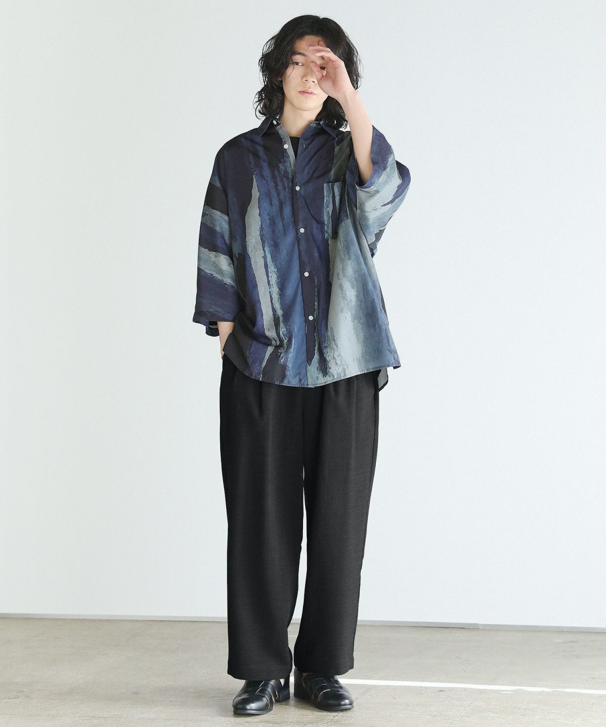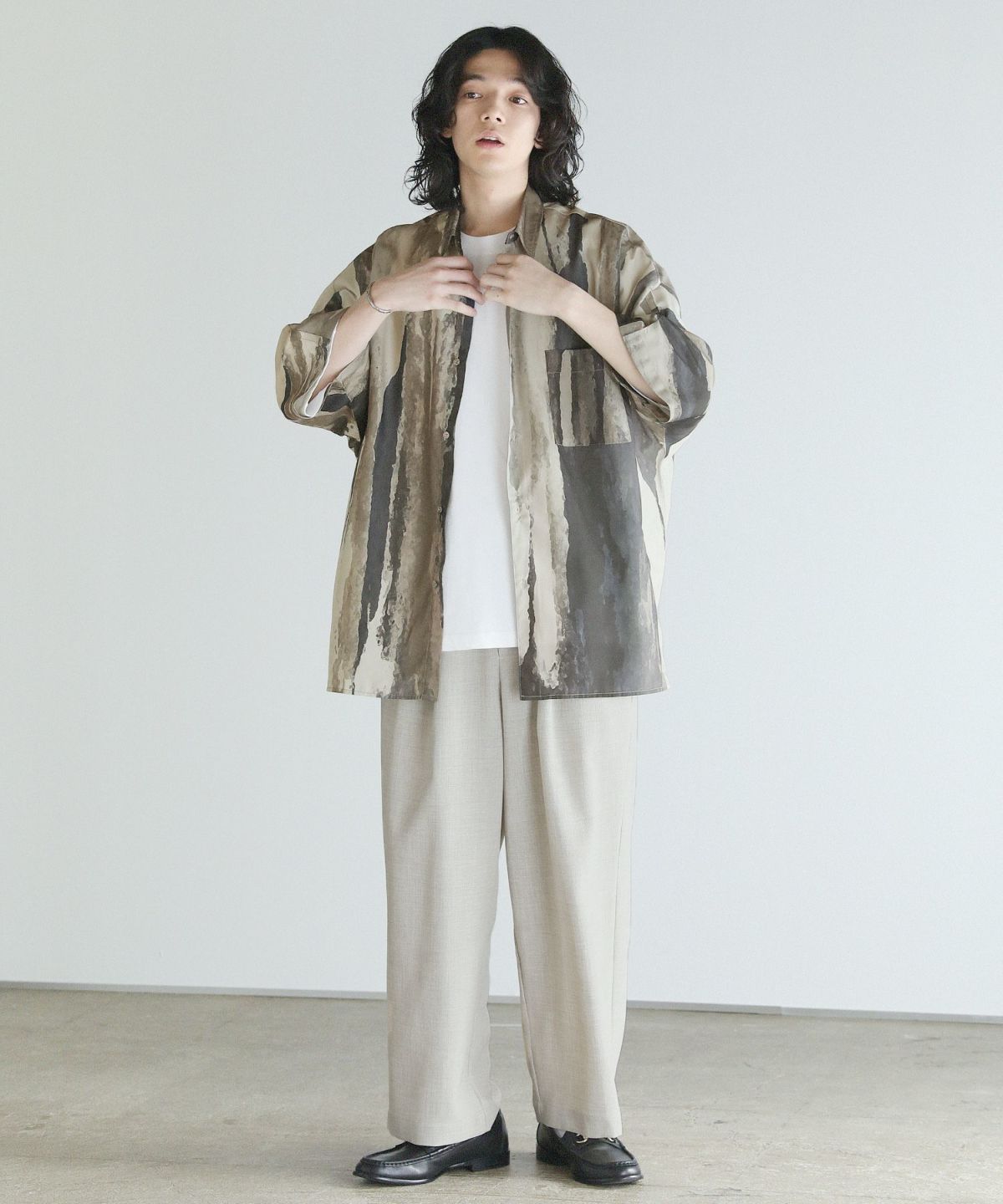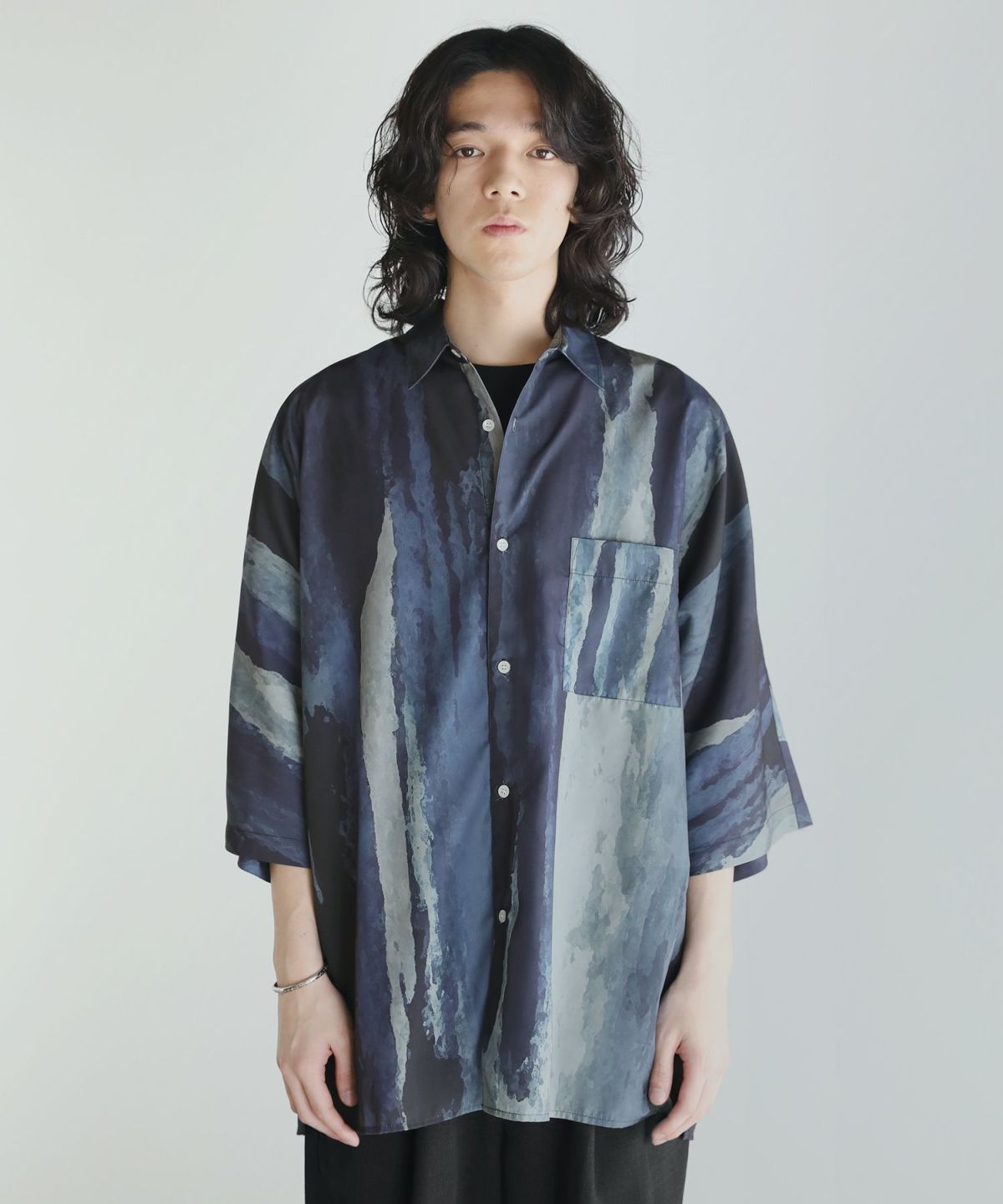 インパクトのあるアブストラクト柄が印象的なドルマンスリーブシャツ。抽象的な大柄のモチーフが印象的で、一枚着でも存在感のあるアイテムです。深い青のネイビー、シックな雰囲気のグレーベージュの2色の展開。派手過ぎない色合いで趣きあるコーディネートができるので、ラフな装いやカジュアルに決めたい時もワンポイントとして役に立つ一着です。
