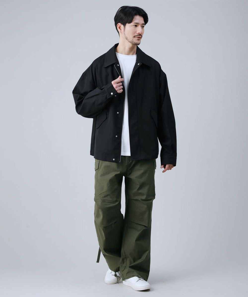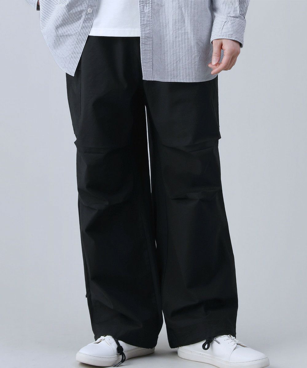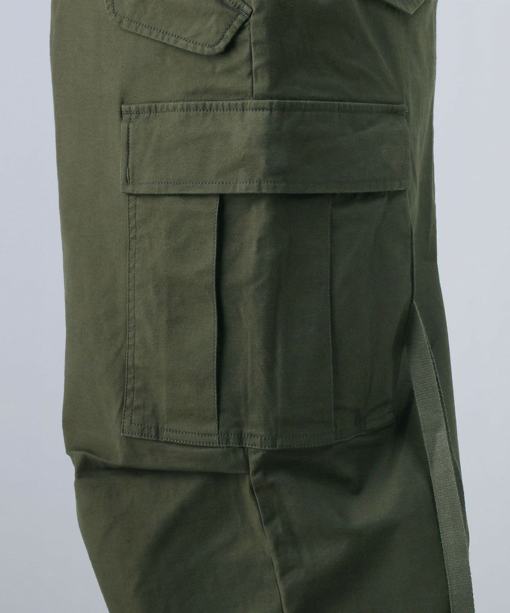 アメリカ軍が採用していたカーゴパンツの代表的モデルであるM-65をベースに、トレンド感のあるワイドシルエットに仕上げました。裾は引き紐付きのため、絞ってパラシュートパンツのような着こなしもお楽しみいただけます。ウエストはゴムと紐を配したイージー仕様で、腰回りに優しくフィットしながら紐を用いた細かいサイズ調整が可能。カジュアルな印象の強いカーゴパンツですが、キレイめアイテムとも合わせられるようにサイドのフラップポケットのマチを無くしてフラットなデザインにしています。サイドポケットから垂らされたテープは揺れ動き、アクセントになります。