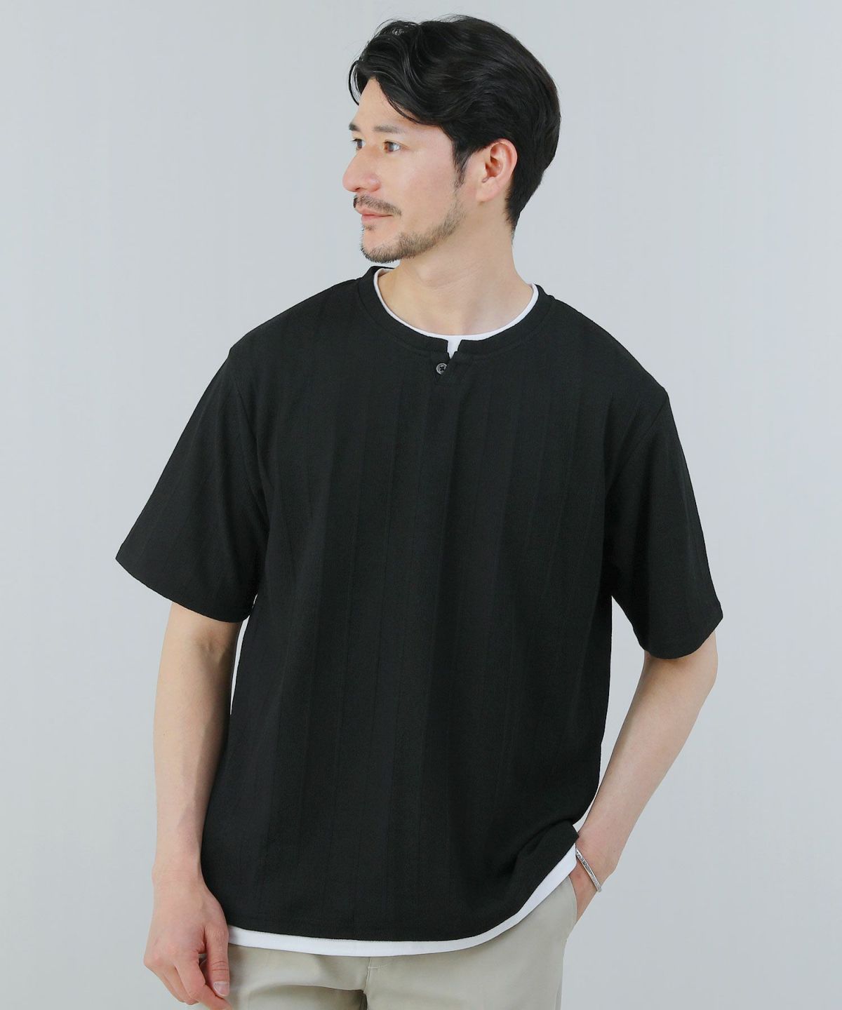 ジャガードストライプヘンリーネックフェイクレイヤード半袖カットソー