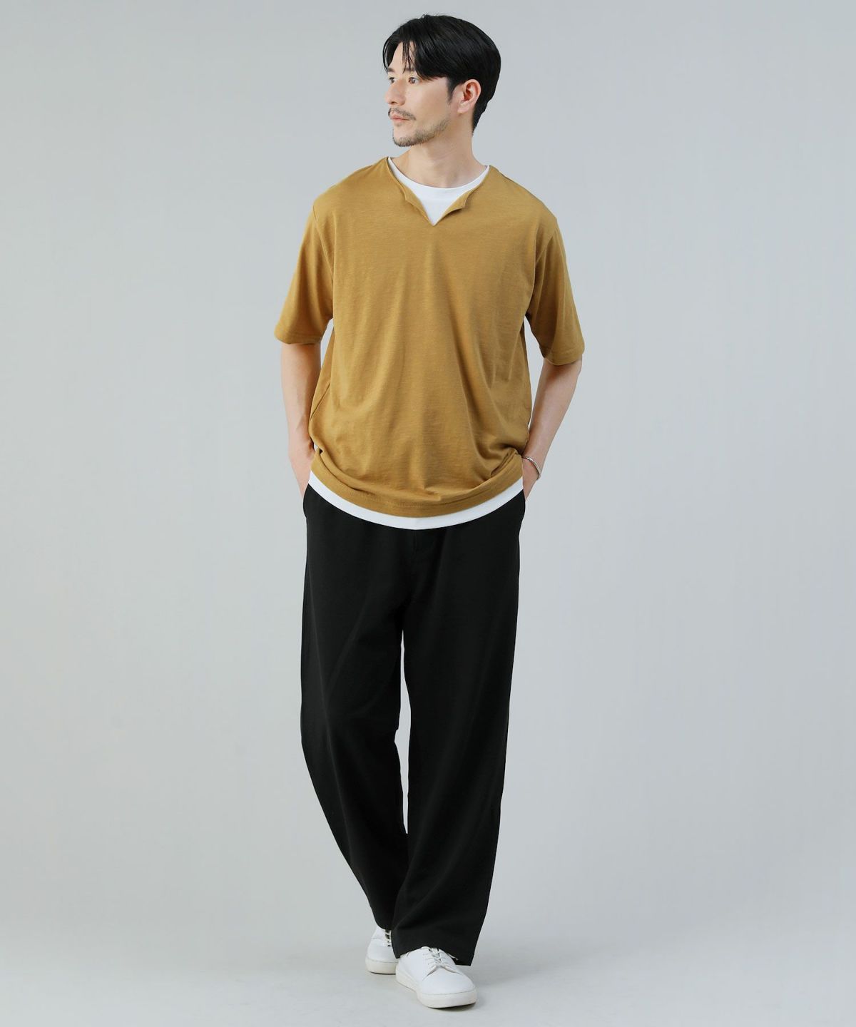 接触冷感/スラブ天竺ヘンリーネックフェイクレイヤード半袖カットソー