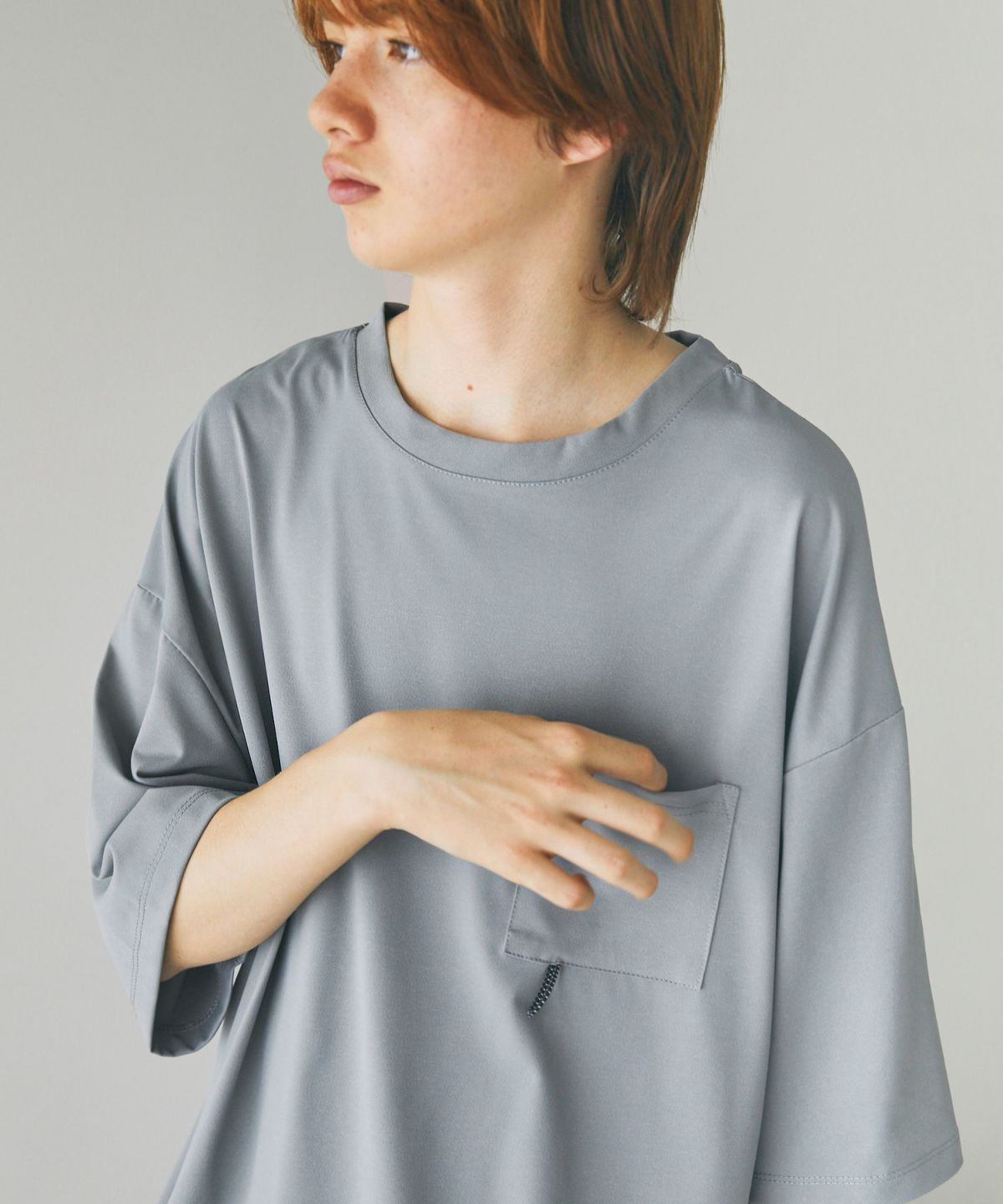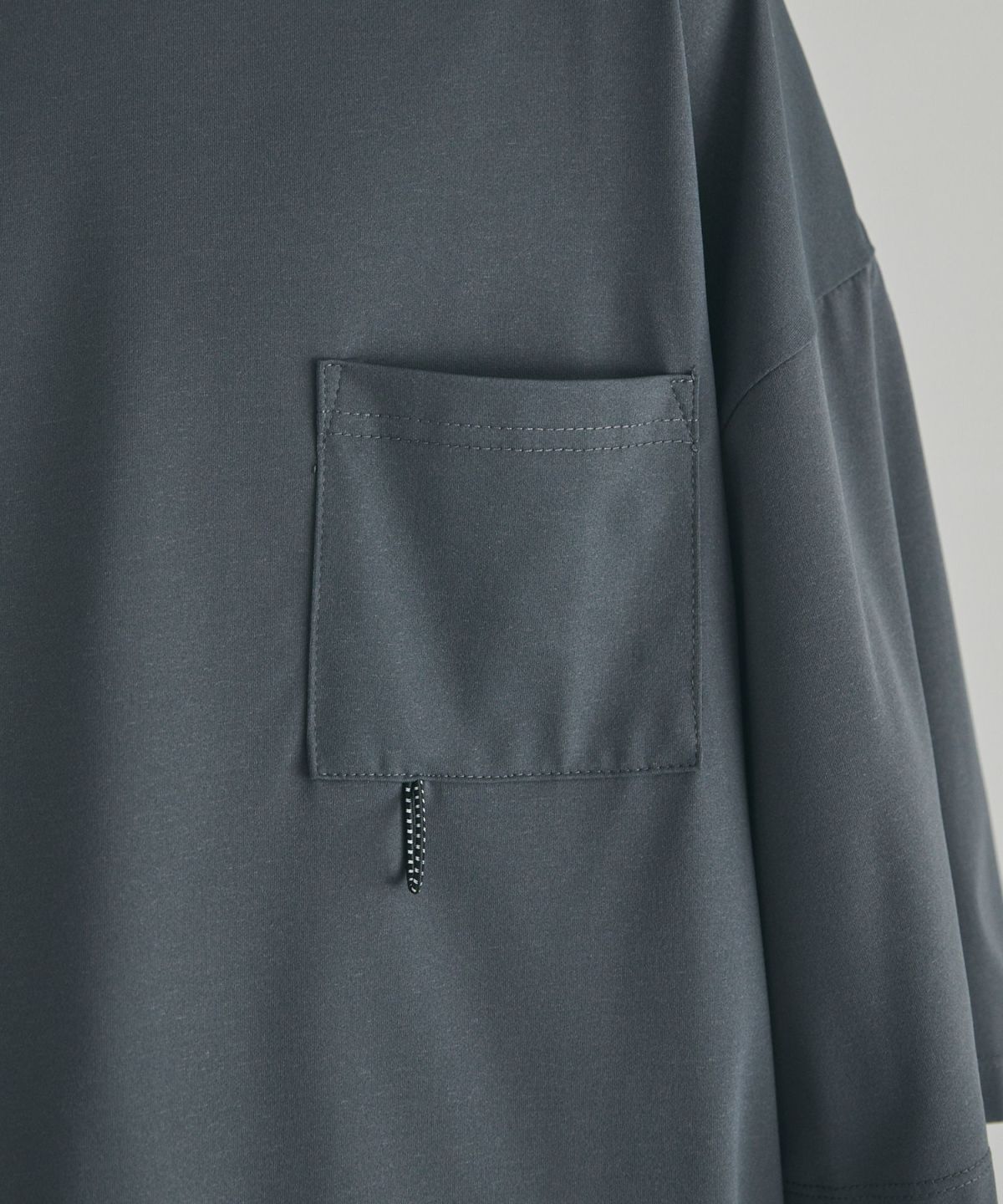 素材にはシャリ感のある風合いと肌離れの良いドライなタッチが魅力のハイツイスト天竺を使用。シワになりにくく毛羽も少ない生地で、クリアで清潔感のある印象を与えてくれます。暑さの続く日も爽やかな着心地でお召しいただけるアイテムです。