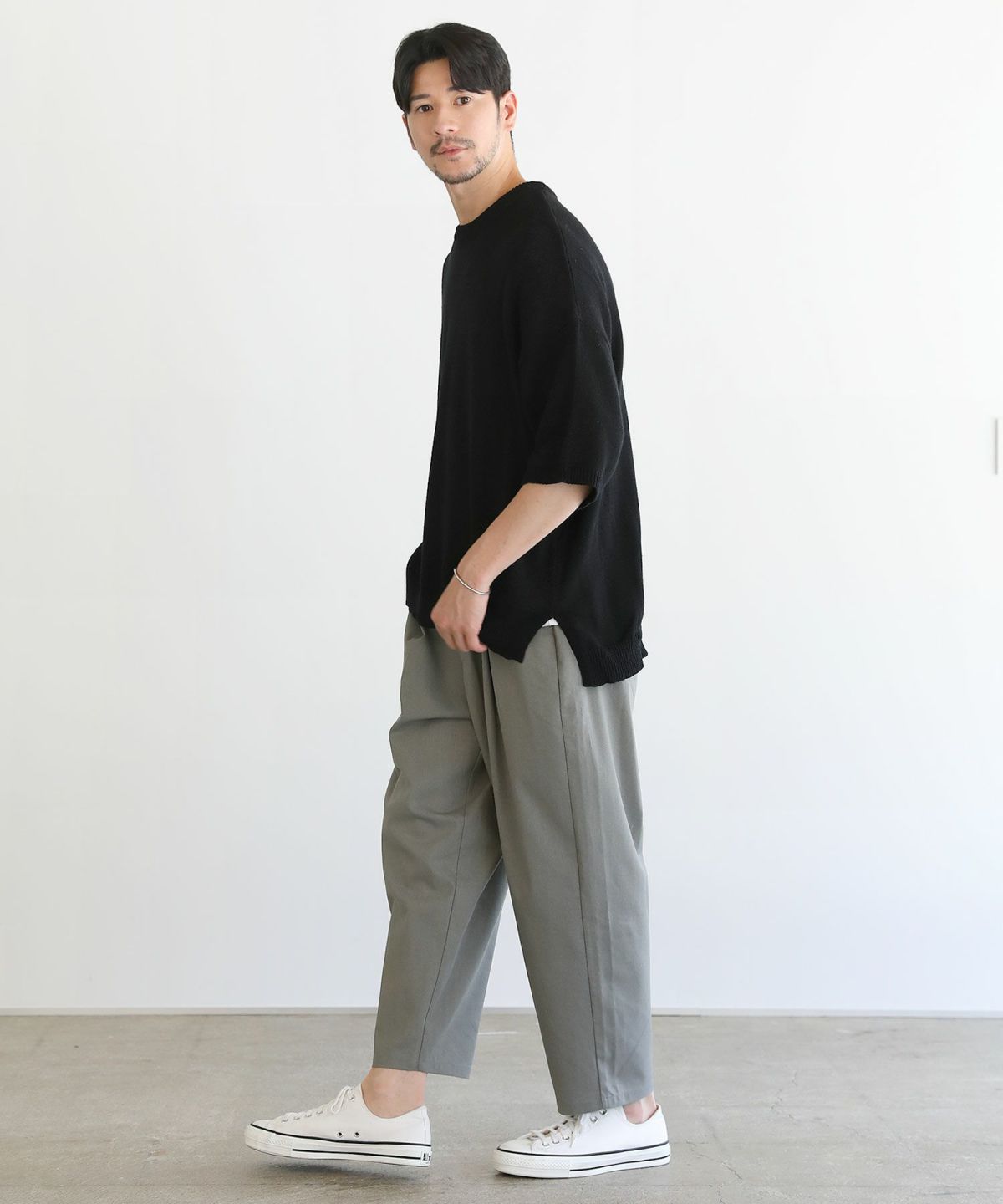 デザイン自体はシンプルなクルーネックニットですが、ざっくりとした編地がこなれ感を高めていので様々なボトムスと合わせやすいのがポイント。ワイドパンツなどの太めのボトムスと合わせれば旬のゆったりコーデが完成。また、細めのスラックスと合わせてYラインシルエットを作るのもおすすめです。