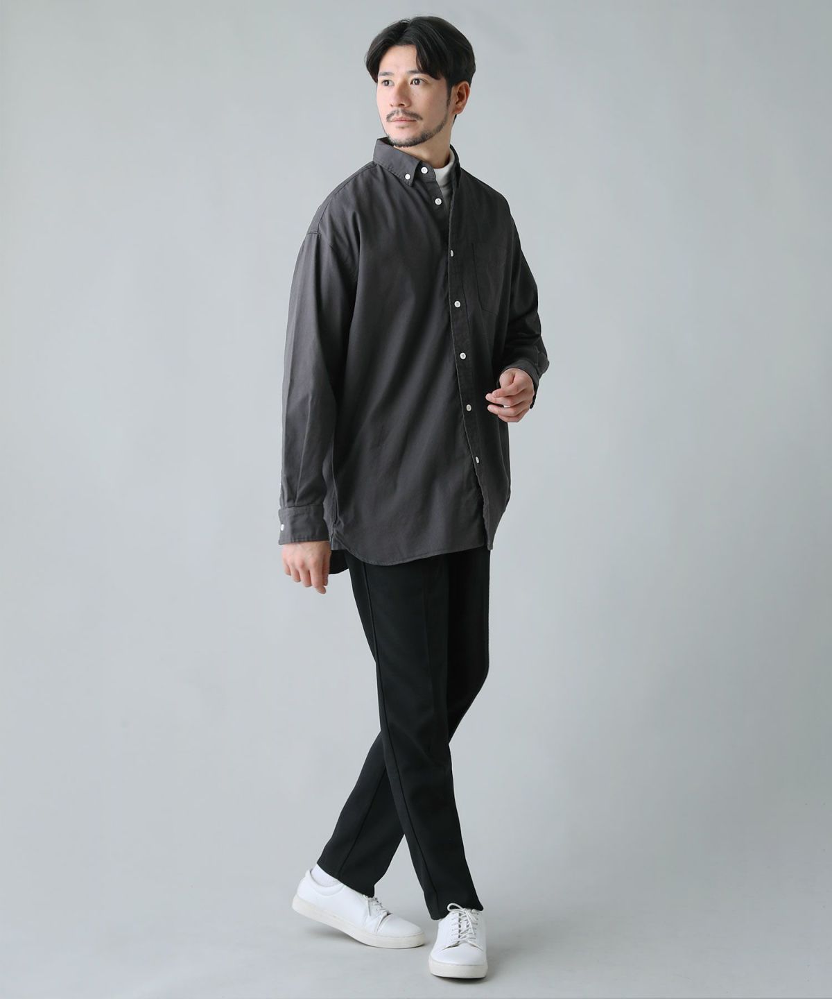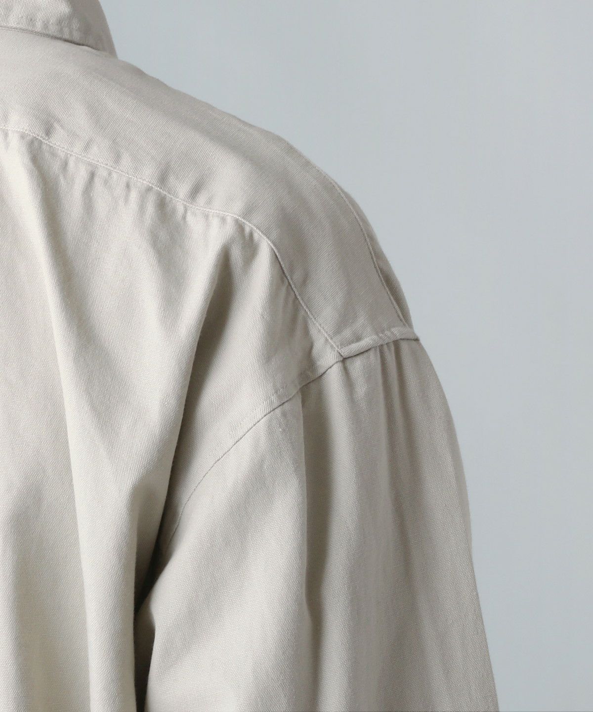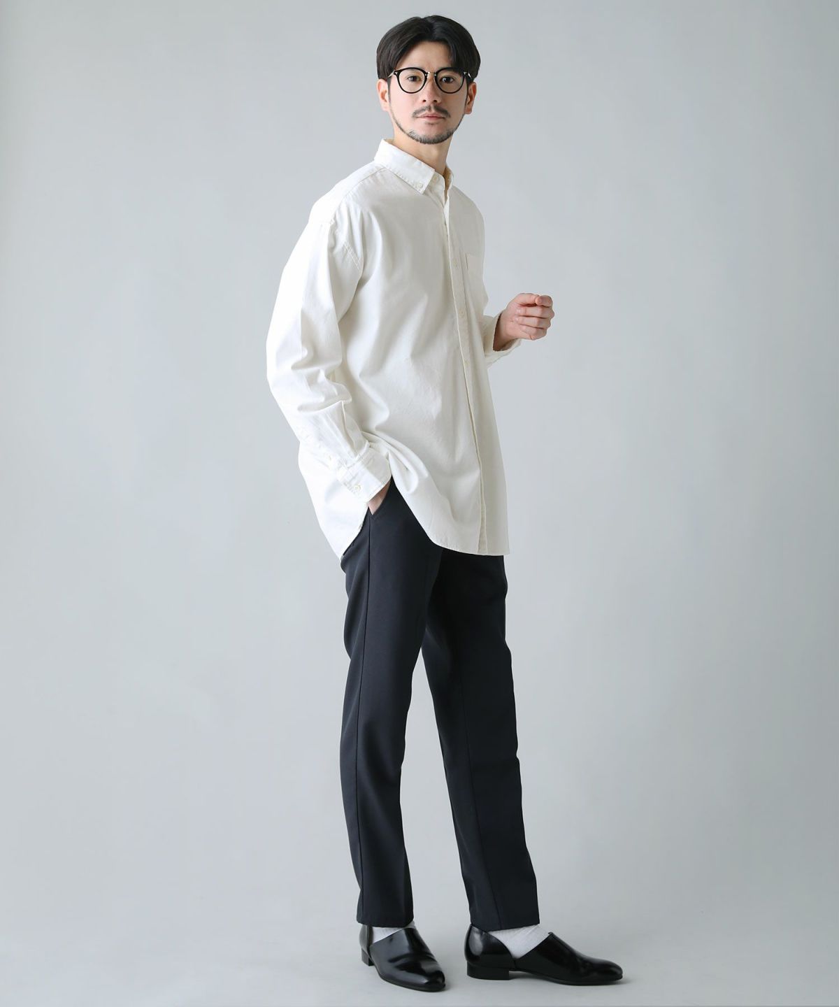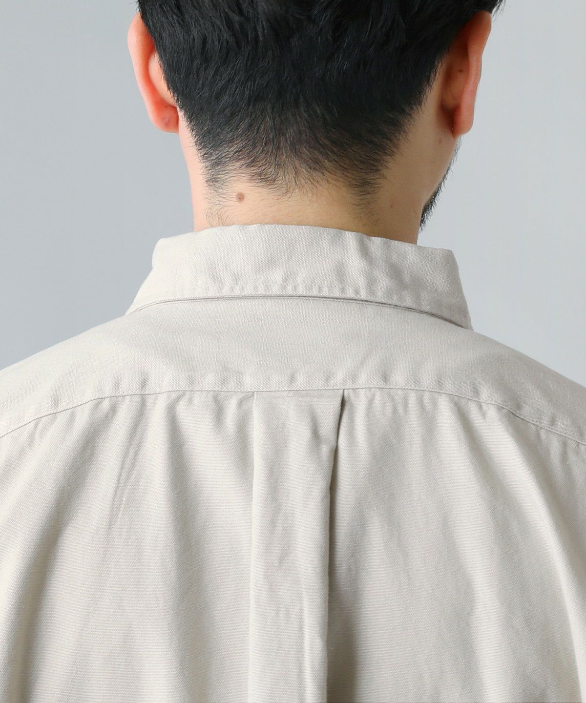 BOX-Aラインシルエットを採用したゆとりのあるサイジングです。どの角度からも綺麗なAラインが生まれるので、インにもアウトにも着用できます。生地には縦糸・横糸を二本ずつ引き揃えて平織りにしたオックスフォード生地を採用。厚手かつ丈夫なのでシワになりにくく、織り目に設けた隙間によって通気性のあるソフトな肌ざわりの生地に仕上がりました。洗うごとに自分の体に馴染み 、柔らかく経年変化する独特な風合いも魅力の一つです。