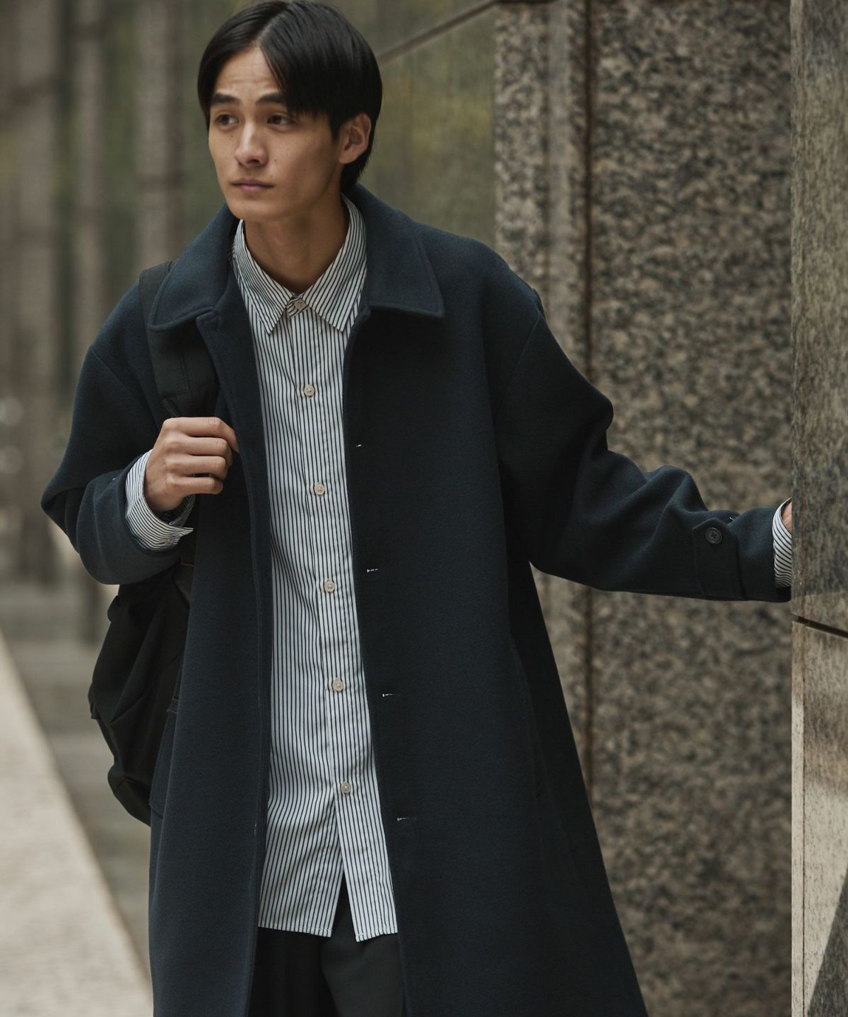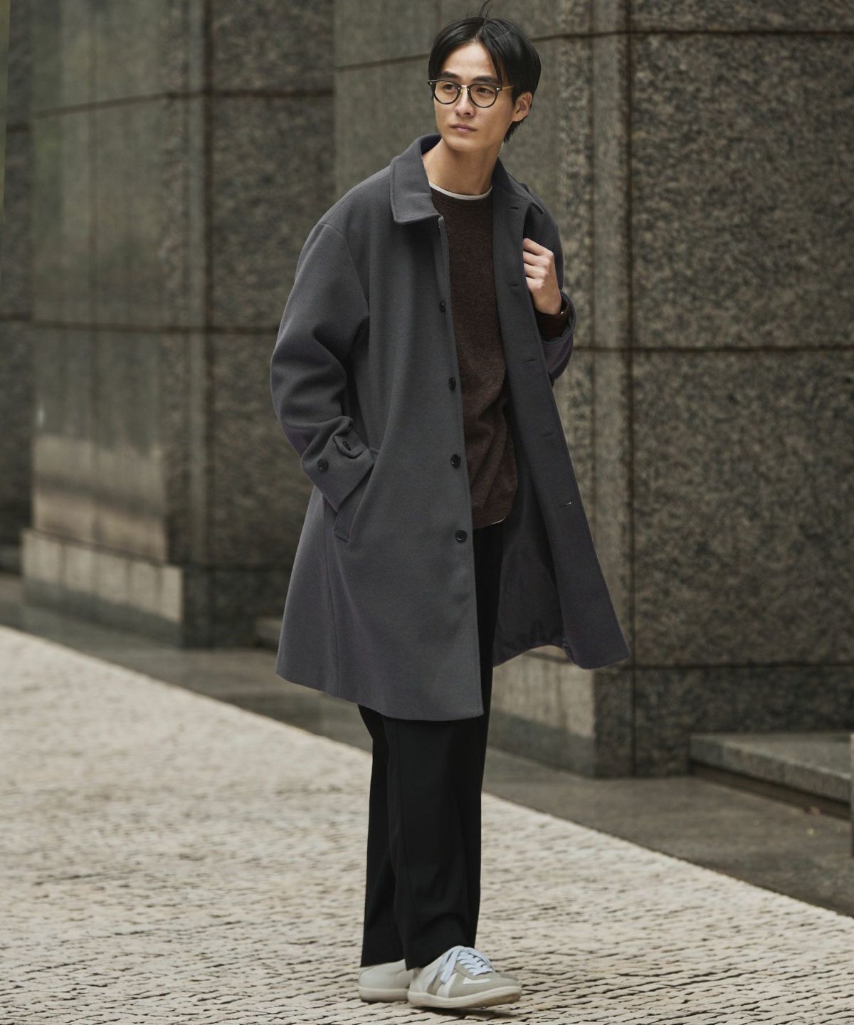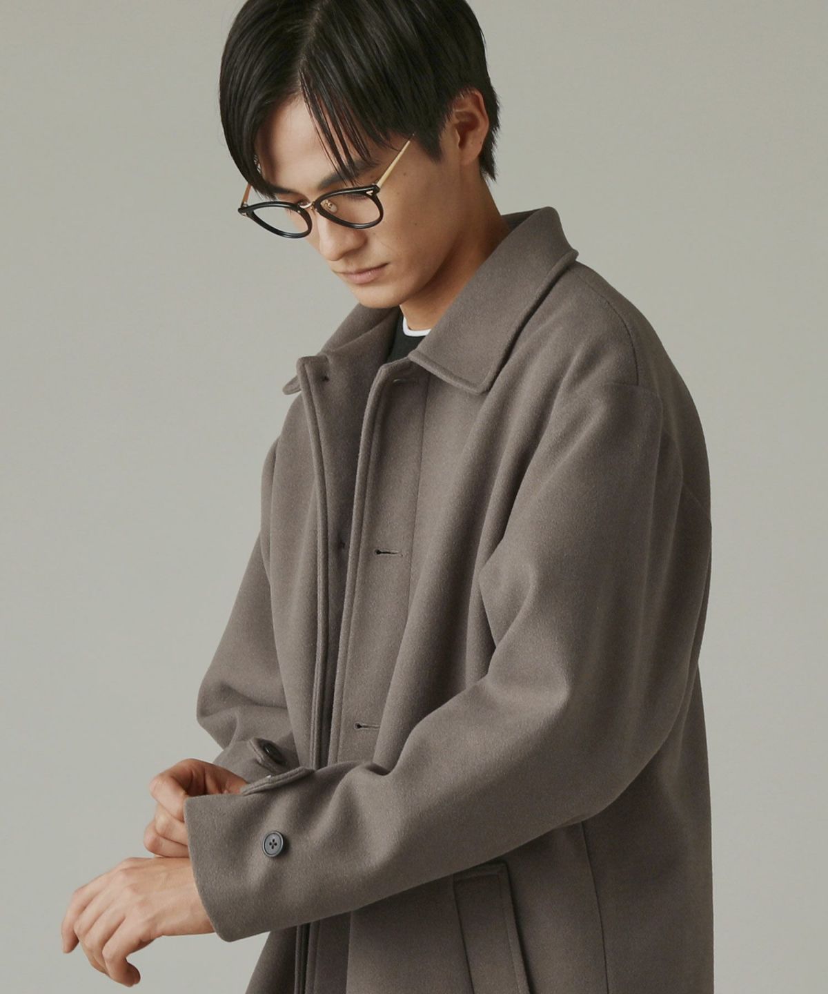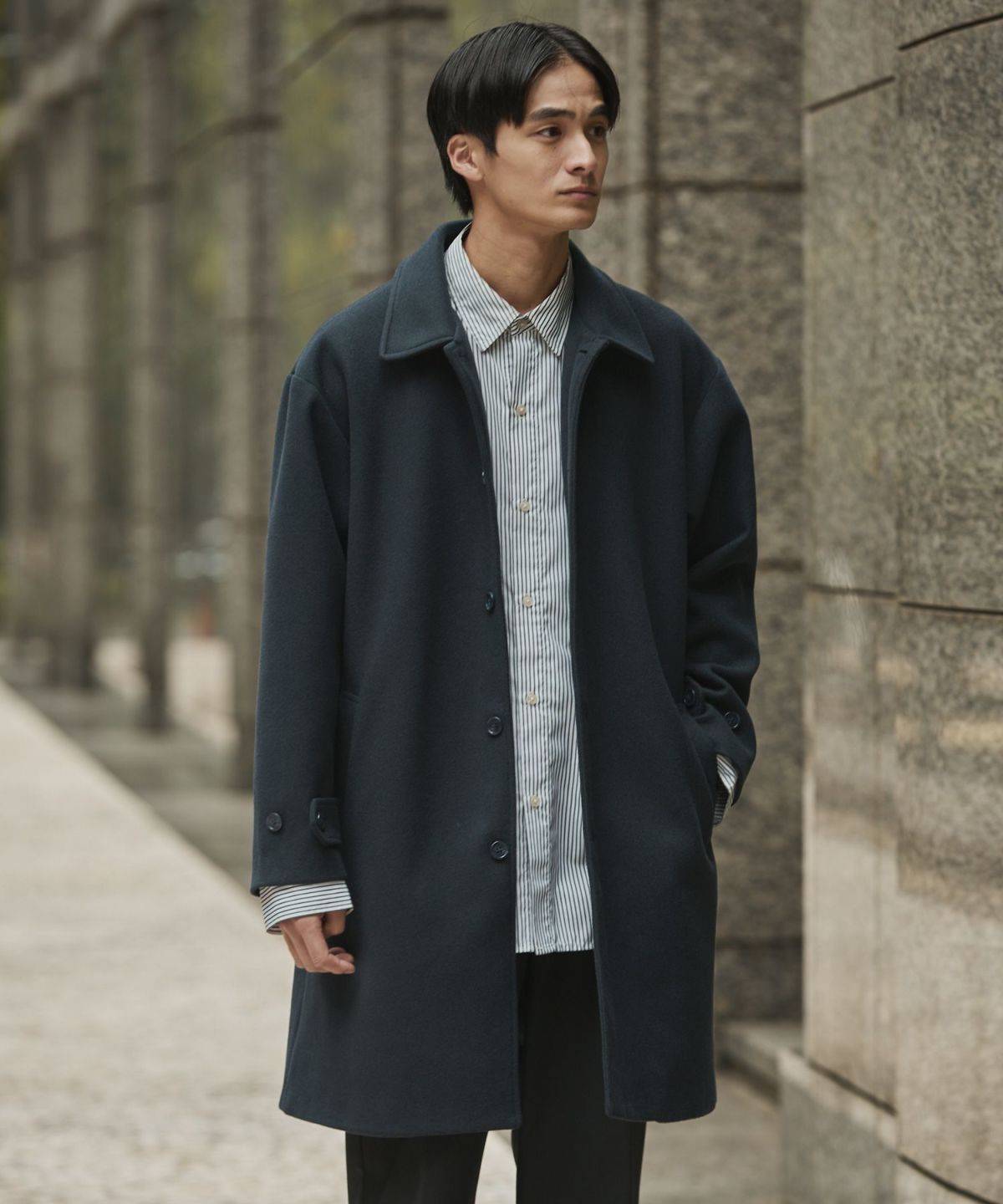あらゆるキレイめコーデと相性が良いだけでなく、スーツスタイルにまで合わせることができてオンオフどちらでも活躍してくれるステンカラーコート。冬はこれさえあれば困らないと言っても過言ではないマストバイアイテムです。昨今トレンドのオーバーサイズアイテムを中に着たとしてもごわつかないように、シルエットはルーズめに設計しております。ゆとりがあるので厚手のニットの上からでも羽織ることもでき、インナーの重ね着も無理なくしていただけます。