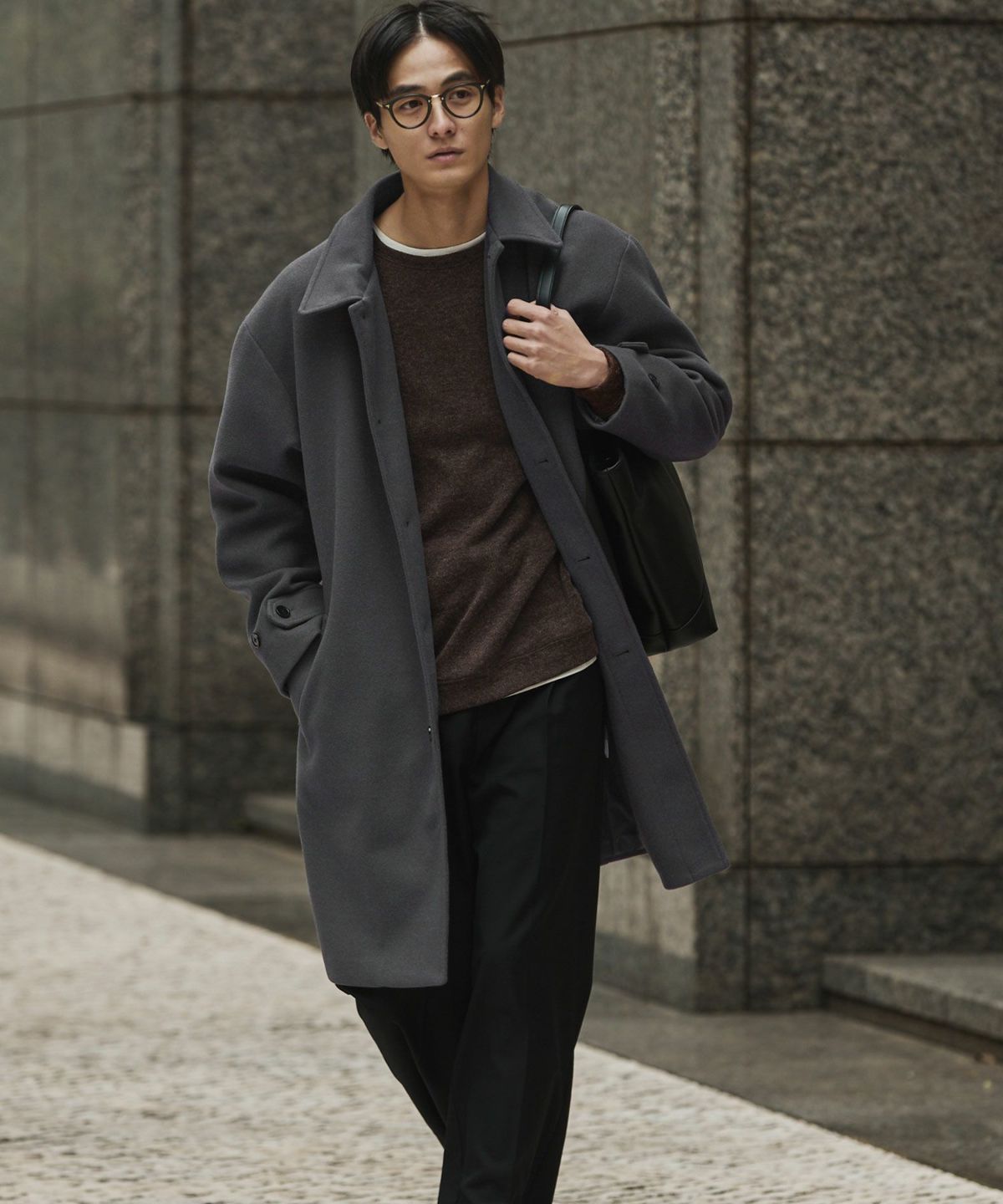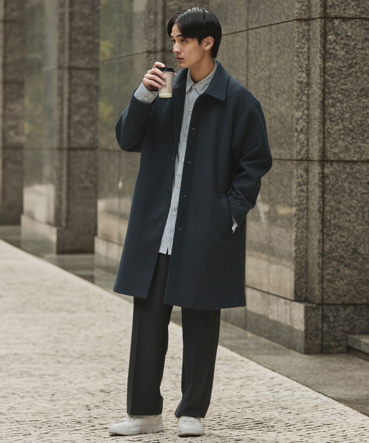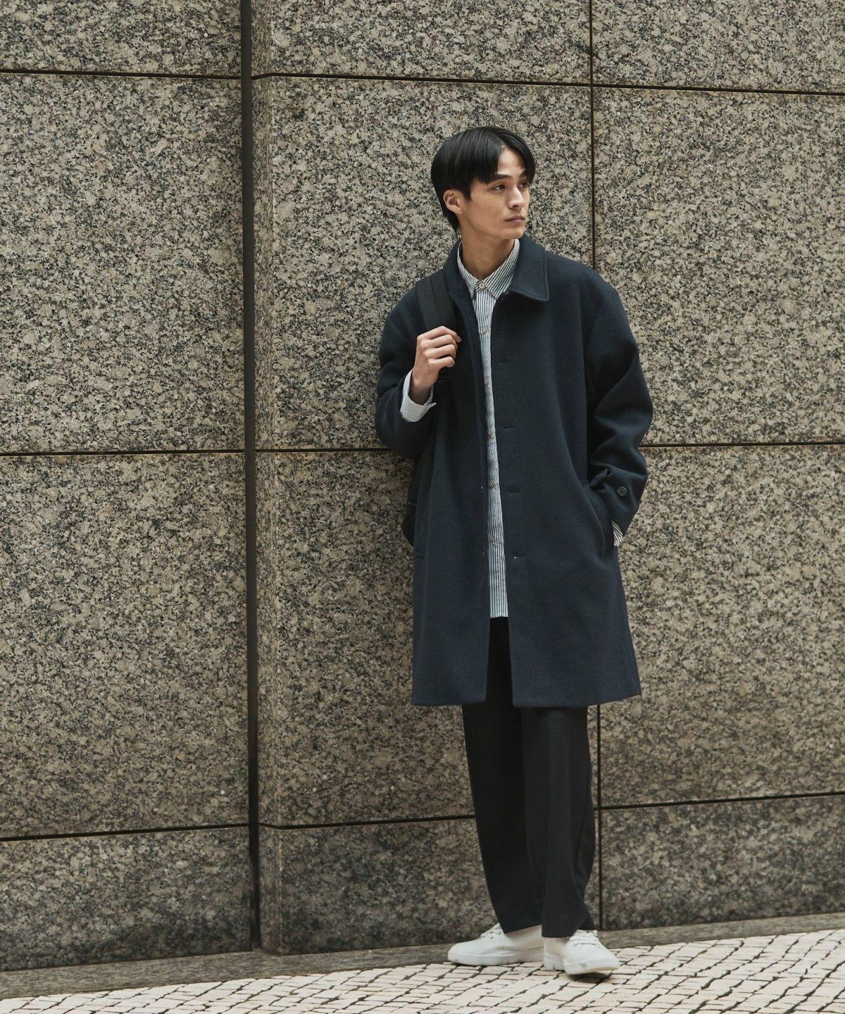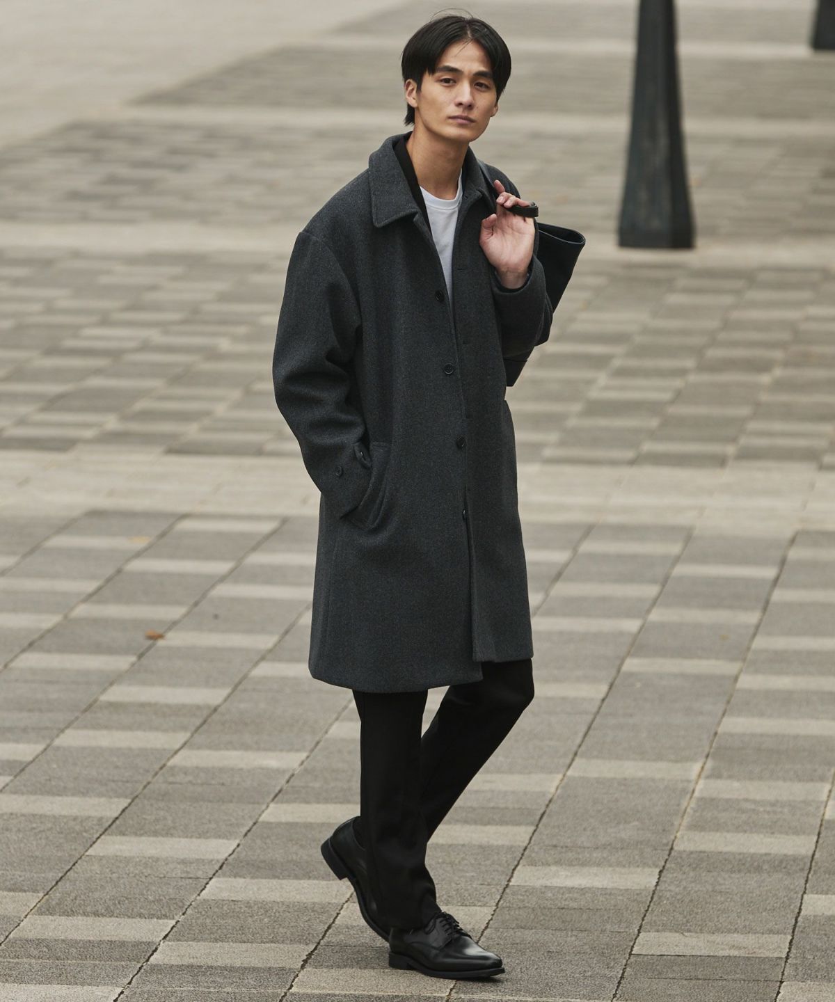 あらゆるキレイめコーデと相性が良いだけでなく、スーツスタイルにまで合わせることができてオンオフどちらでも活躍してくれるステンカラーコート。冬はこれさえあれば困らないと言っても過言ではないマストバイアイテムです。昨今トレンドのオーバーサイズアイテムを中に着たとしてもごわつかないように、シルエットはルーズめに設計しております。ゆとりがあるので厚手のニットの上からでも羽織ることもでき、インナーの重ね着も無理なくしていただけます。