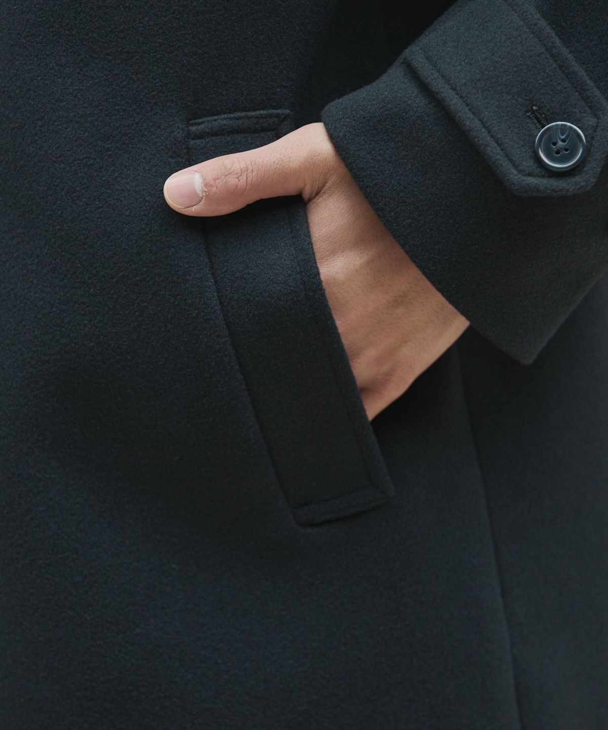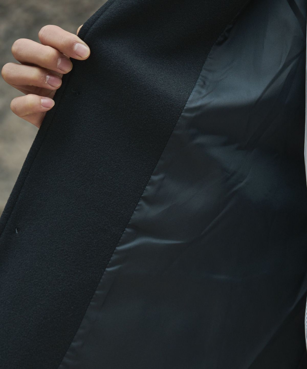 長さは足さばきの邪魔にならないように膝丈に。着丈の長いコートは動きにくくなりがちですが、今回は後ろに深めのセンターベントを入れることで動きやすい一着に仕上げました。両サイドのポケットは中の物が落ちにくいよう手がすっぽりと入る大きさで深めのつくりにしています。裏にはポリエステルのつるつるとした裏地を付けているので脱ぎ着するのもラクラクです。