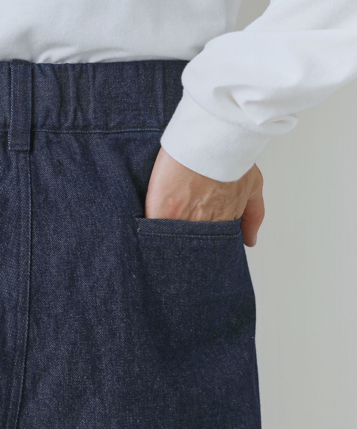腰部分は全周ゴムウエストを採用したイージー仕様となっており、内側には紐を施すことで細かい調整が可能です。ベルトループも付いているため、トップスをタックインしたスタイリングもサマになります。両サイドのポケットの他、バックには片玉縁ポケットを配しており、スッキリとした上品さを感じられる雰囲気に仕上げました。