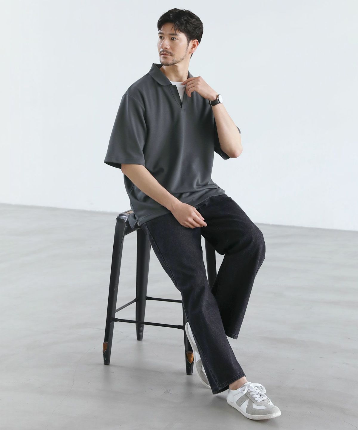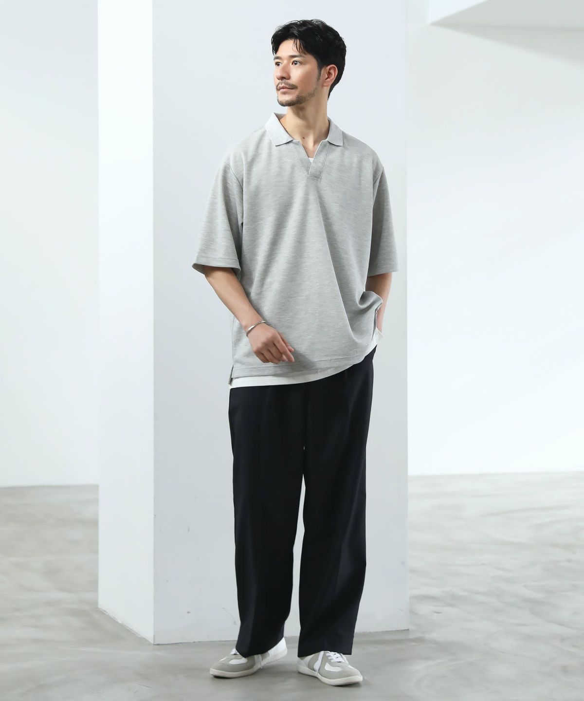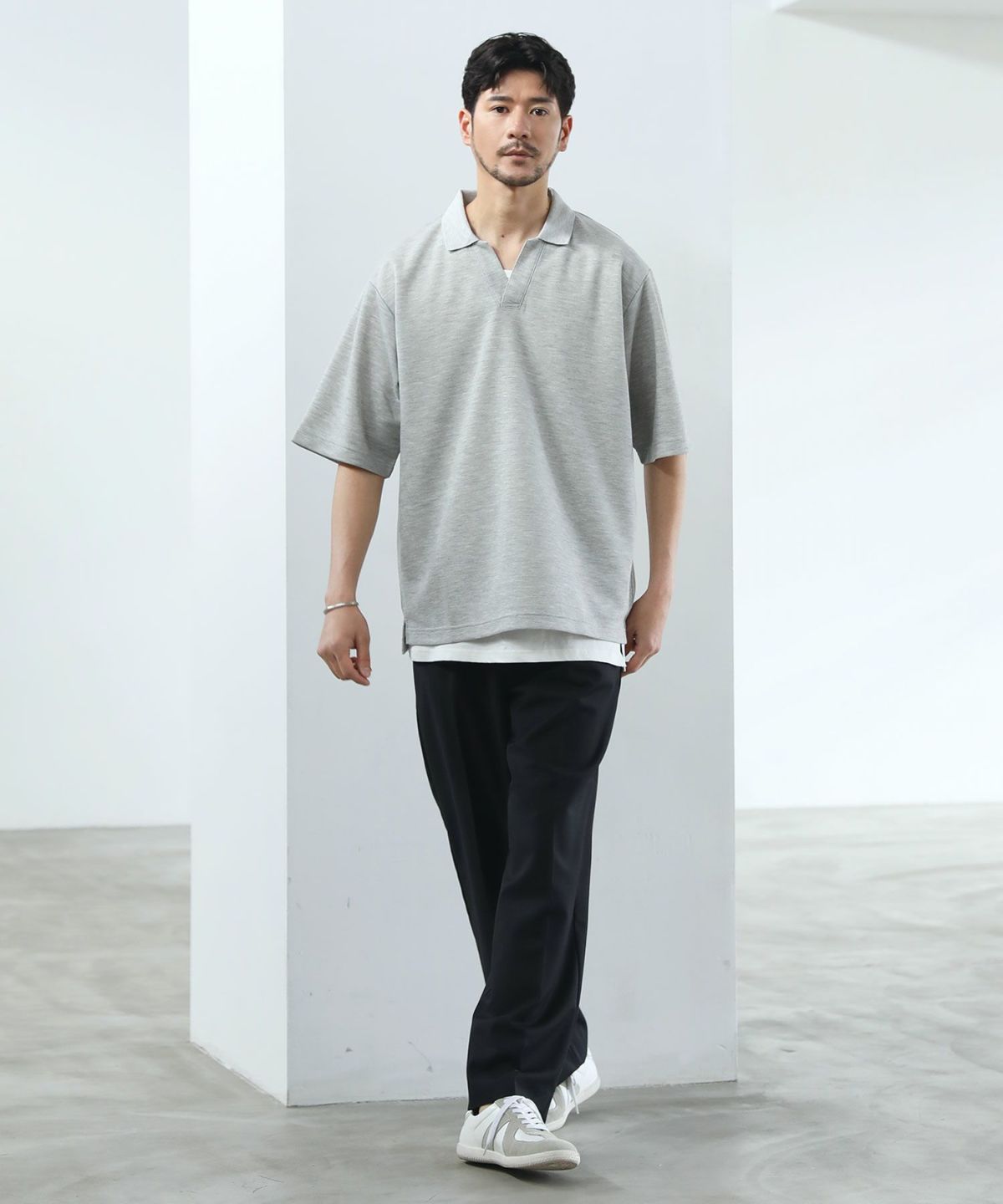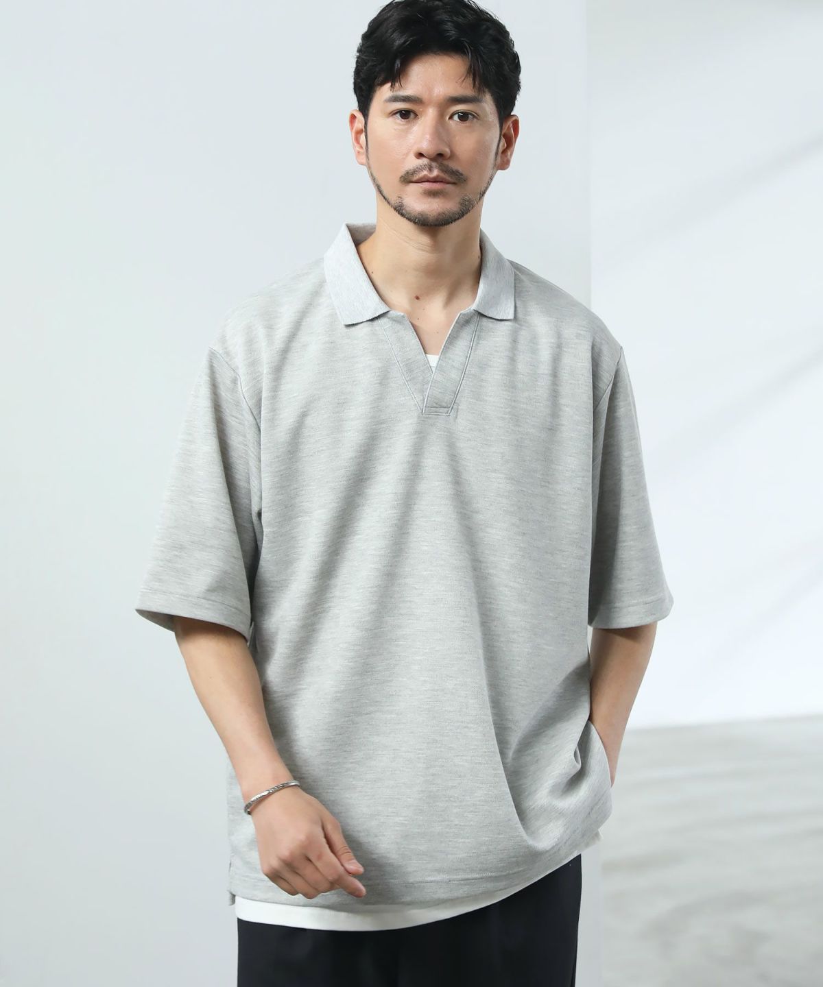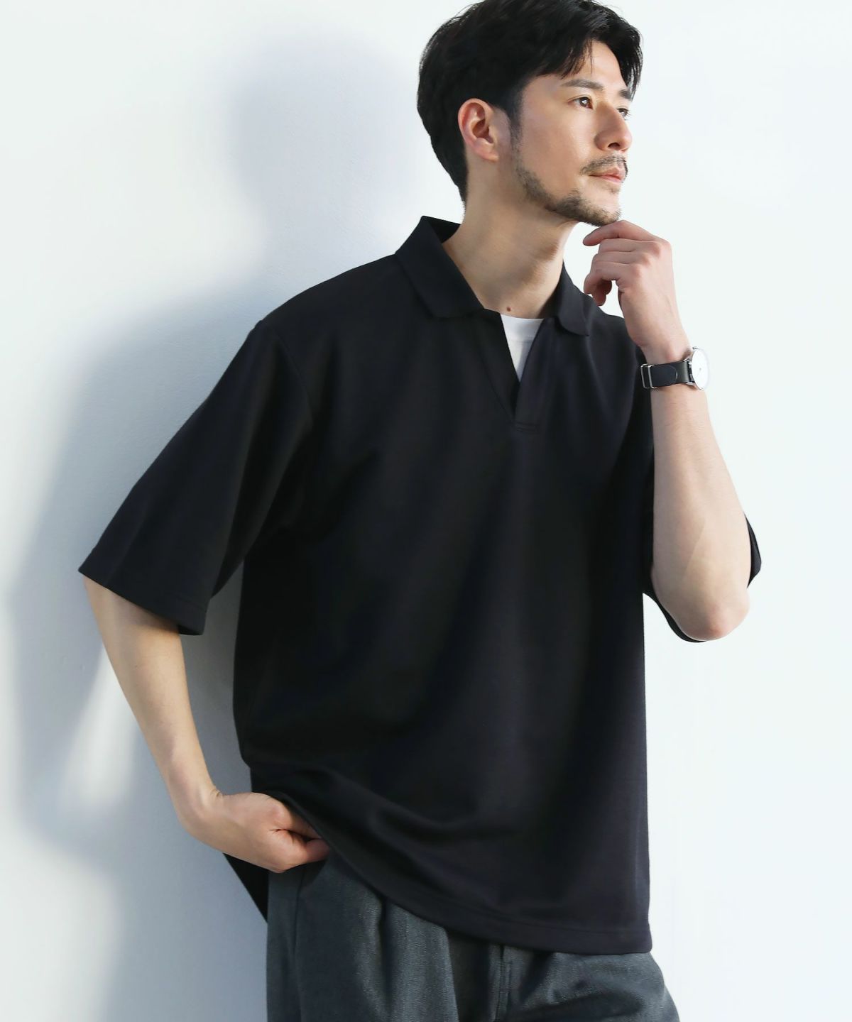 ひんやりとした着心地を体感できる接触冷感スキッパーポロシャツです。身幅と腕ぐりにたっぷりとゆとりを持たせ、動きやすくルーズな旬のシルエットに仕上げました。通常のポロシャツと違い、胸元のボタンを取り除いたスキッパースタイルにすることで胸元に自然な抜け感をプラスしています。また、抗菌防臭機能と接触冷感機能を併せ持った特殊な生地を使用。オンにもオフにも活躍する汎用性の高いデザインで、汗ばむ夏のシーズンでも涼しく清潔にご着用いただけます。
