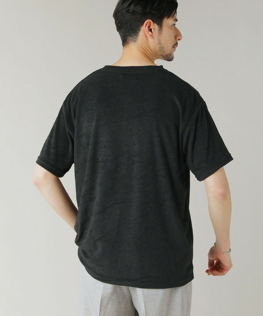 生地はポリエステルと綿を混紡した、パイル生地を使用。タオルのような優しい肌触りで通気性が良く、汗ばむ季節にぴったりです。さらに肌に触れるとひんやり感じられる接触冷感機能を持たせ、暑い季節にも爽やかな着心地を実現。シワになりにくく、ご自宅での洗濯が可能なイージーケア素材なのも嬉しいポイントです。