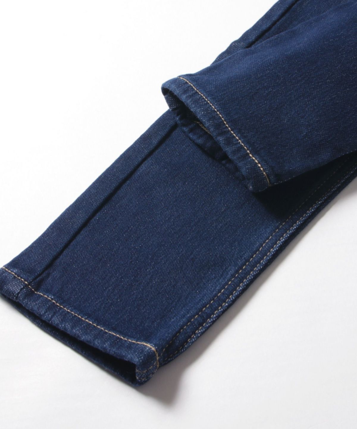 伸縮性を生み出すポリウレタンを混紡した柔らかなカット地にインディゴ染めを施すことで本格的なデニム生地に仕上げました。ストレッチが効いているため筋肉質な方にもおすすめ。しっかり脚にフィットします。デニム生地のようにごわついたり生地が突っ張ったりしないため、動きやすく抜群の穿き心地です。