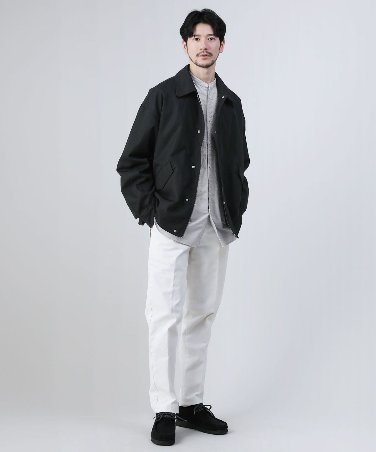 前・後ろから見るとボックスシルエットになり、横から見た時にはAラインシルエットとなる、ボクシーAラインシルエットになっています。窮屈感のないゆとりのあるサイジングで、歩いたときに後ろ身頃の生地に動きが出るお洒落なデザイン。サイドに丸く入ったスリットもアクセントになっています。ボタンを留めてスタイリッシュに着こなしていただくほか、ゆとりのあるデザインを活かしたレイヤードスタイルもお楽しみいただけます。