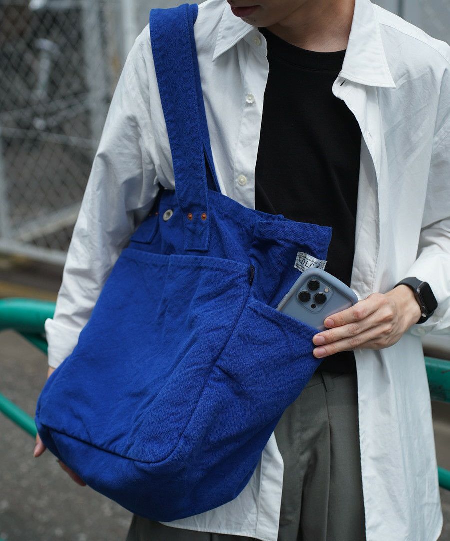 一見シンプルな見た目に隠された各所のポイントデザインに面白さを見出してしまう、倉敷帆布を使用した大容量なトートバッグ。普段使いから、一泊二日程度の旅行なら任せられてしまう、そんな頼もしい収納力に、柔らかな倉敷帆布がいい味を感じさせます。もしかすると使用シーンが限られてしまうかも。それでも手元に持っておきたいと思わせてくれる魅力を感じる逸品です。