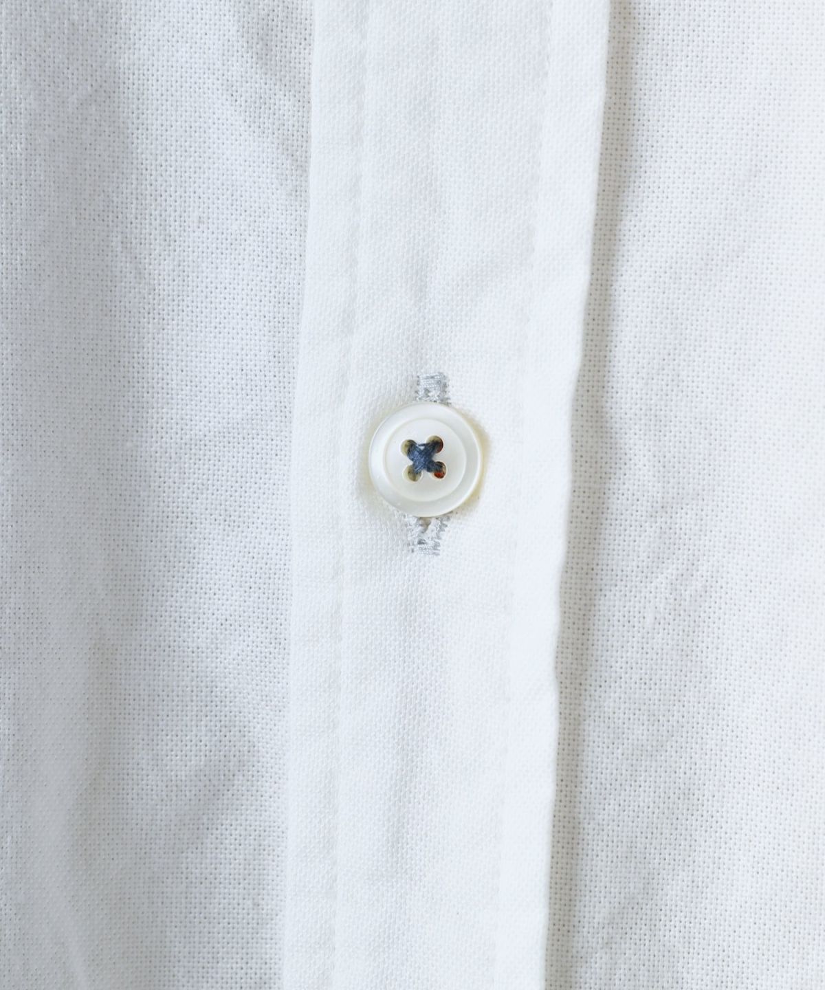 襟はキレイめにもカジュアルテイストにも合わせやすい、スタンダードなレギュラーカラーを採用しました。ボタンを開けたときに見える下前立ての配色ラインが、着こなしにお洒落なアクセントを添えます。ボタンにはブルーやグレーの付け糸を使用しており、細部にまでこだわったデザイン性が魅力です。さらに、前後差のある着丈がコーディネートに程よく抜け感をプラス。細身すぎない、ややゆとりを持たせたレギュラーシルエットで一枚着としてもインナーとしても使いやすいサイズ感となっております。