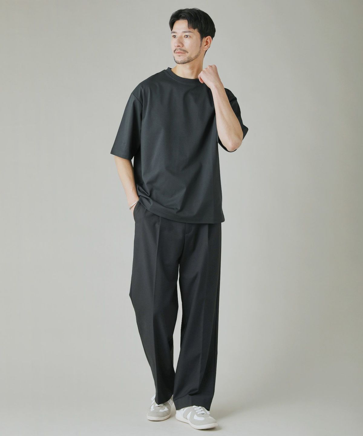デザインのアクセントに太めに編まれたリブ襟を採用しました。ポンチ生地タイプは着回しやすいシンプルなTシャツ型に。カノコ生地タイプは、サイドの縫い目をフロント側に入れ込んで前後差を付けた、立体的な作りとなっております。どちらもドロップショルダーに5分袖と、トレンドのオーバーサイズ感を演出するデザインを取り入れつつも、大きすぎずコンパクト過ぎないルーズシルエットに仕上げています。