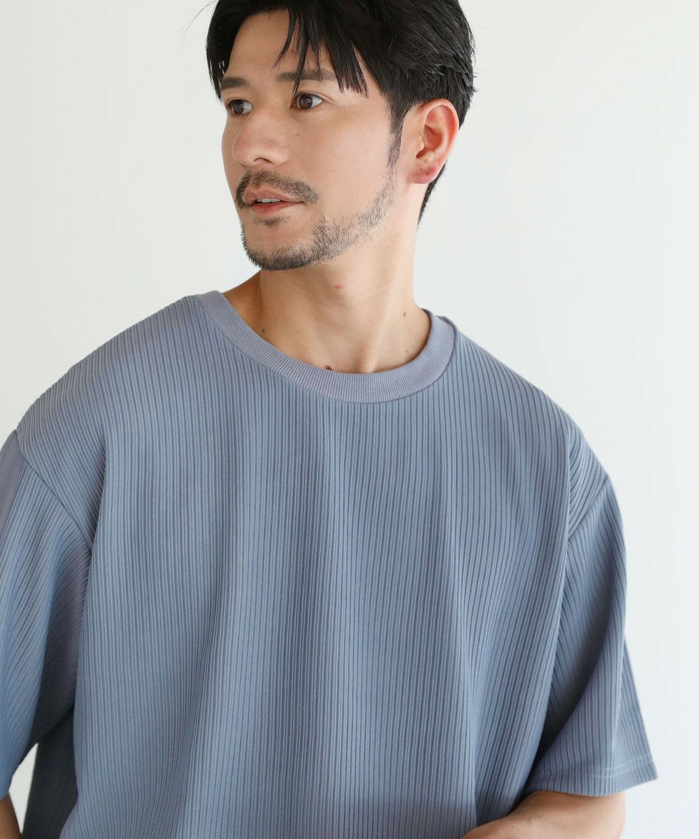 立体的な縦ストライプが浮かび上がった柔らかなリップル生地、さり気ない鹿の子編みを取り入れたハリ感のあるポンチ生地の2種類の生地でご用意いたしました。ただの天竺生地とは異なる表情豊かな生地感でスタイリングに奥行きを生み出してくれます。