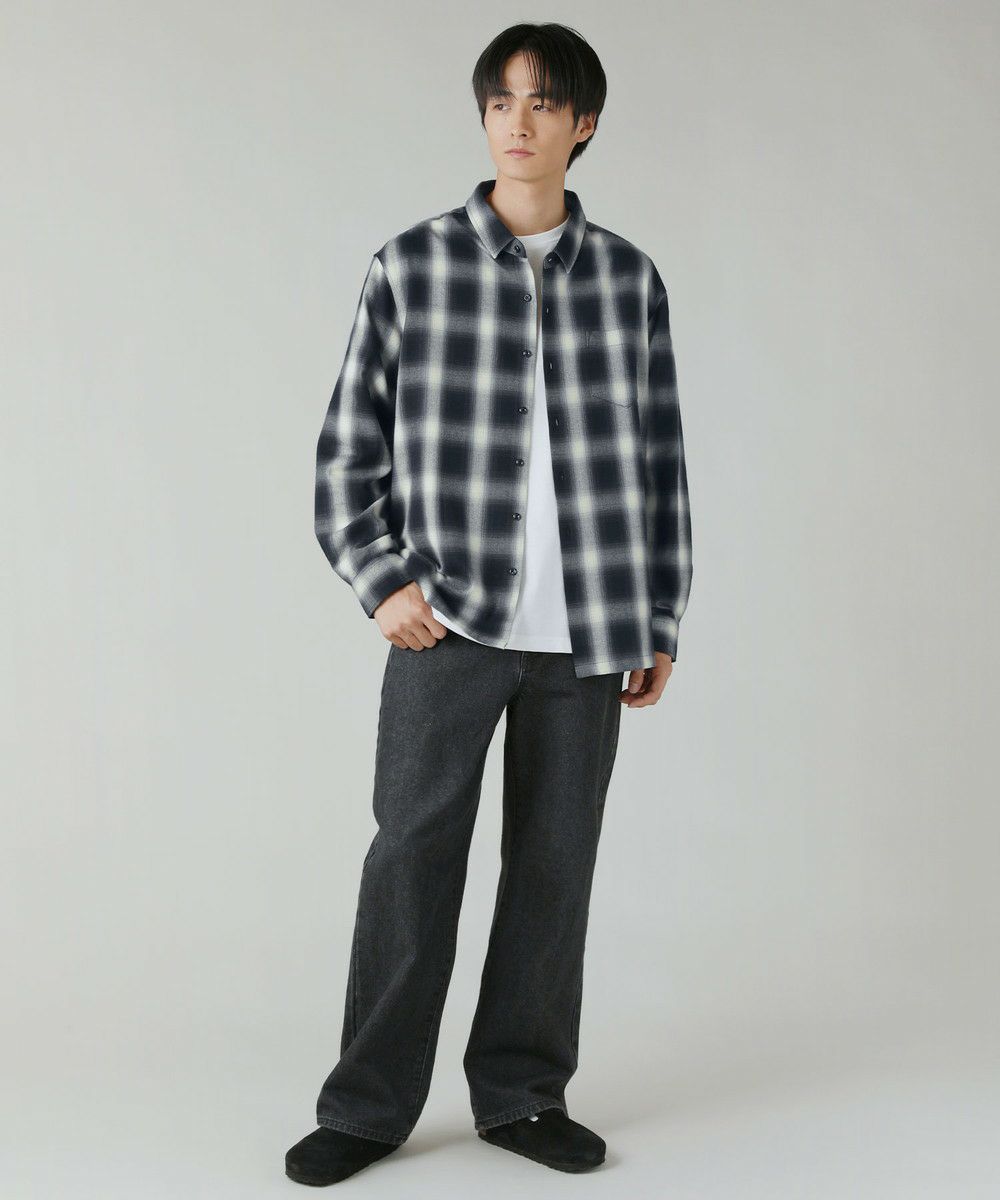 リラクシングシルエットオンブレチェックレギュラーカラー長袖ネルシャツ
