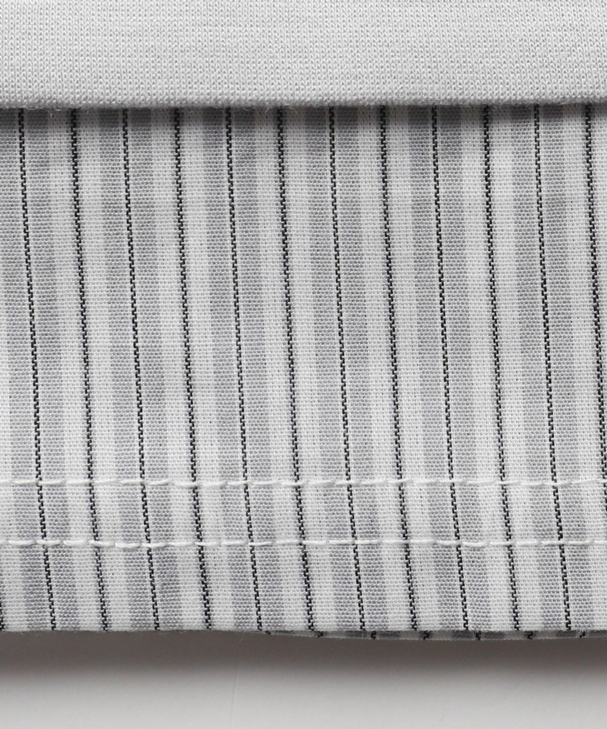 ふっくらとしたポンチ生地で仕立てています。程よいストレッチ性とドレープ感があり、肌当たりの優しい生地です。生地表面にはほのかな光沢があり、上品な印象を与えます。レイヤード部分の布帛生地は全色モノトーンのストライプ柄を採用しました。さりげないストライプ柄がコーディネートのアクセントになります。