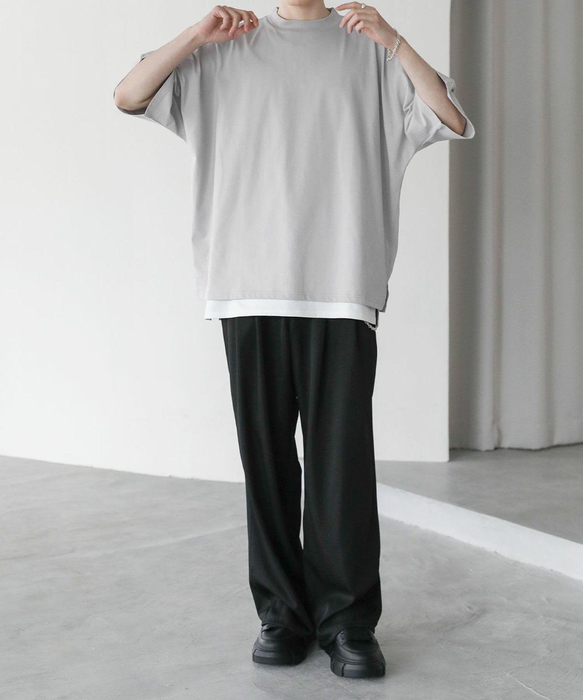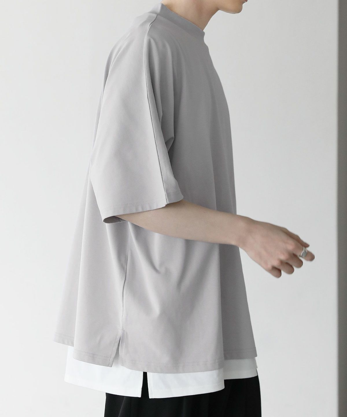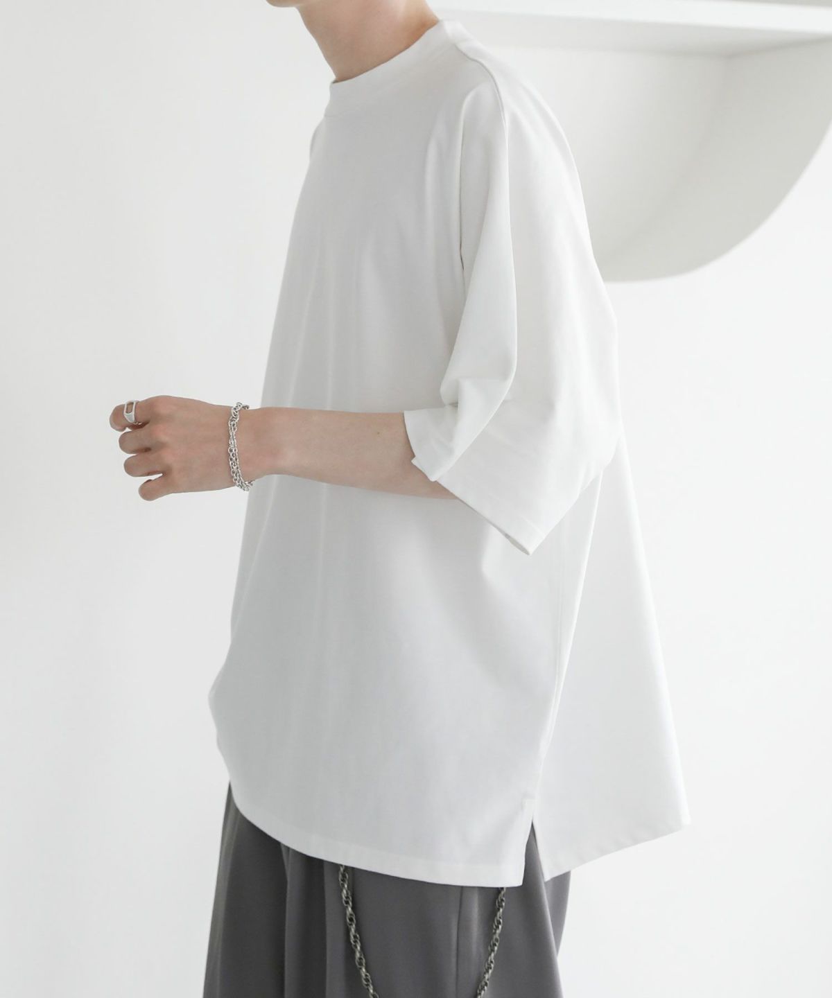 大きくとったアームホールと肩の落ちたドルマンスリーブで、ゆったりとした綺麗なオーバーサイズシルエットに仕上げました。さらに、襟元に高さのあるモックネックTのため、カジュアルさの中にもキレイめな印象をプラス。ワイドデニムと合わせるラフなコーディネートから、スラックスと合わせるキレカジコーデまで様々な着こなしが可能です。