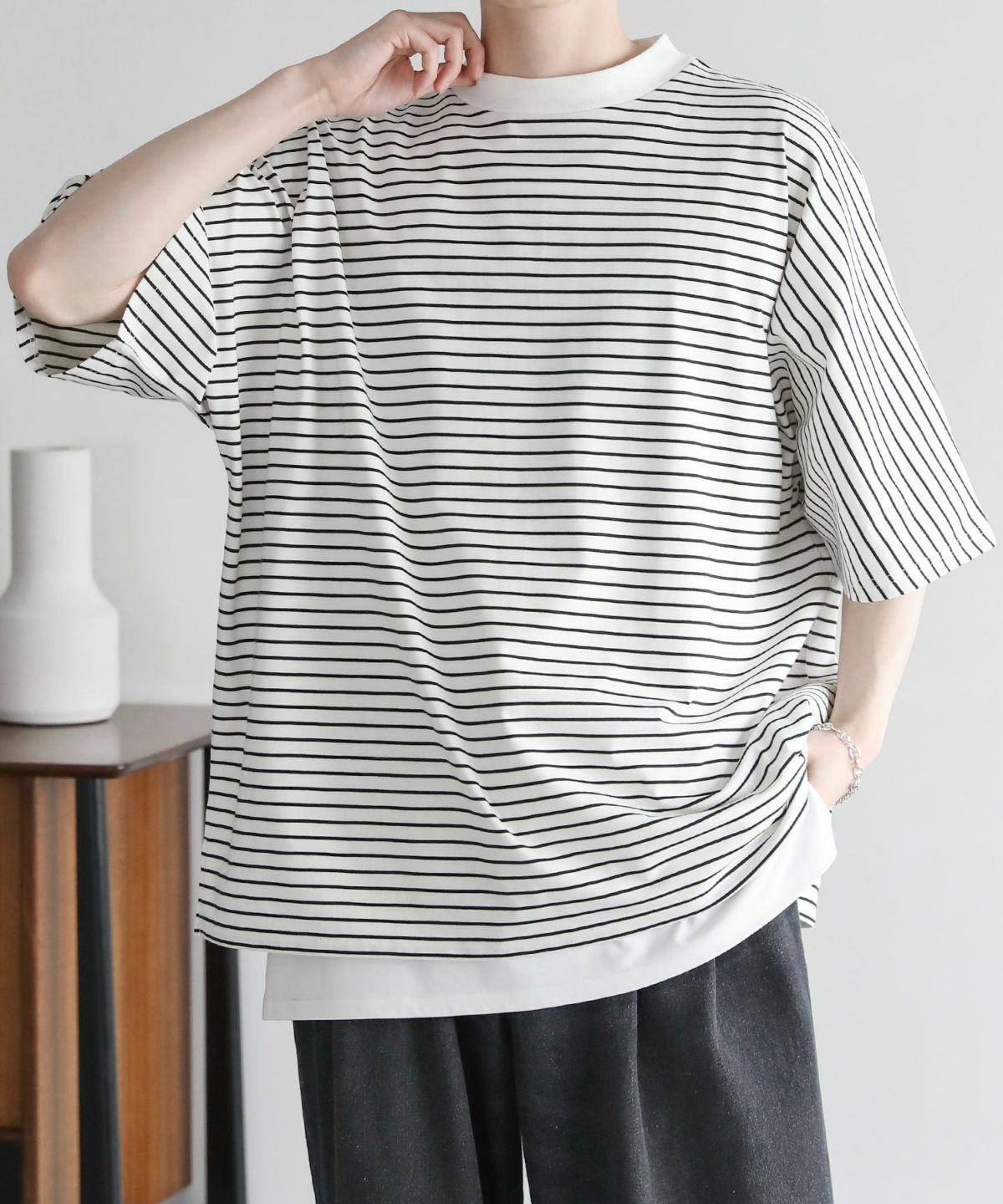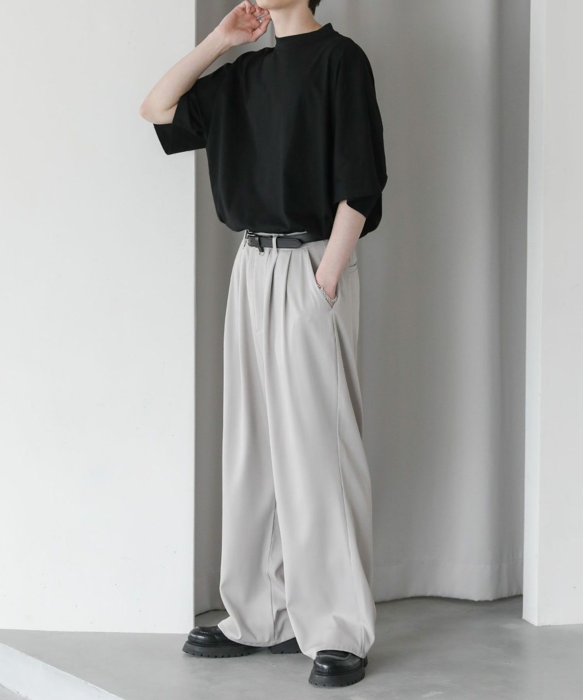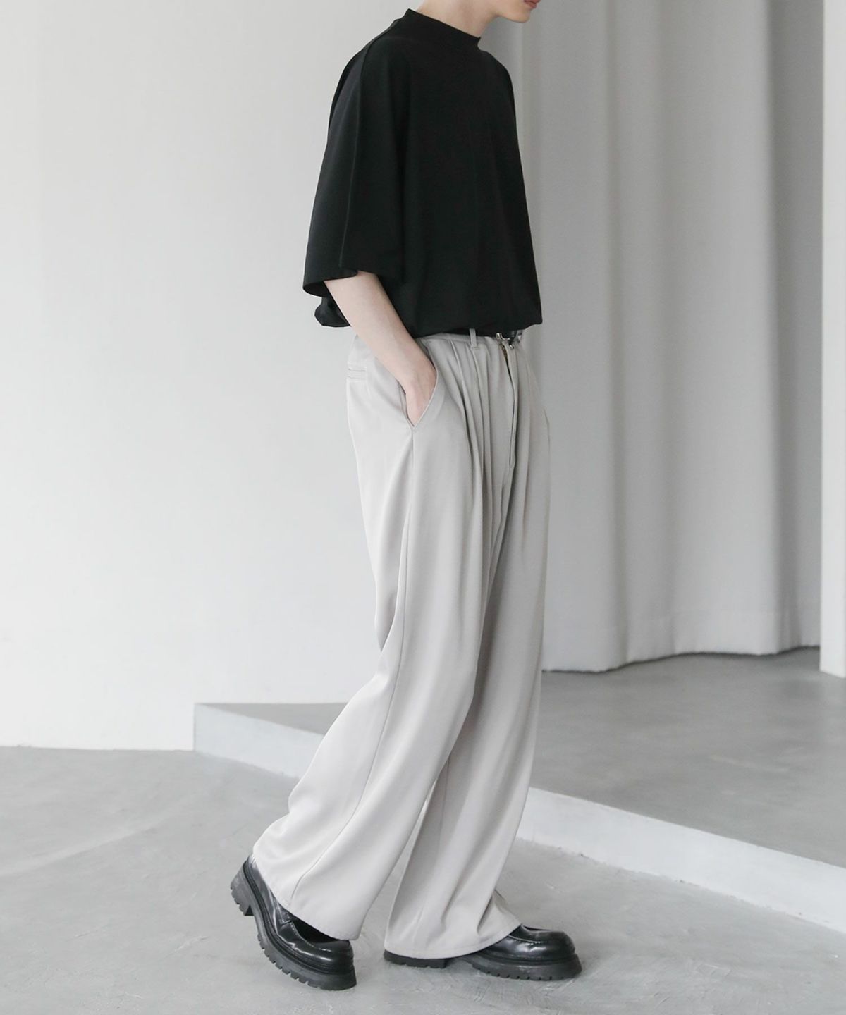 大きくとったアームホールと肩の落ちたドルマンスリーブで、ゆったりとした綺麗なオーバーサイズシルエットに仕上げました。さらに、襟元に高さのあるモックネックTのため、カジュアルさの中にもキレイめな印象をプラス。ワイドデニムと合わせるラフなコーディネートから、スラックスと合わせるキレカジコーデまで様々な着こなしが可能です。