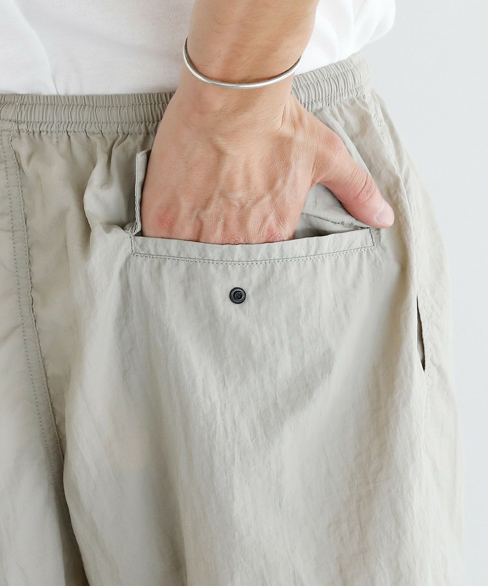 ウエストはゴムと紐を配したイージー仕様で、着用時のフィット感もバッチリ。左裾にはブランドを象徴するロゴ刺繍を施し、さりげないアクセントを加えました。ゆったりとしたシルエットがリラクシーな印象を演出しつつ、程よい丈感でルーズになりすぎない絶妙なバランスに仕上げています。
