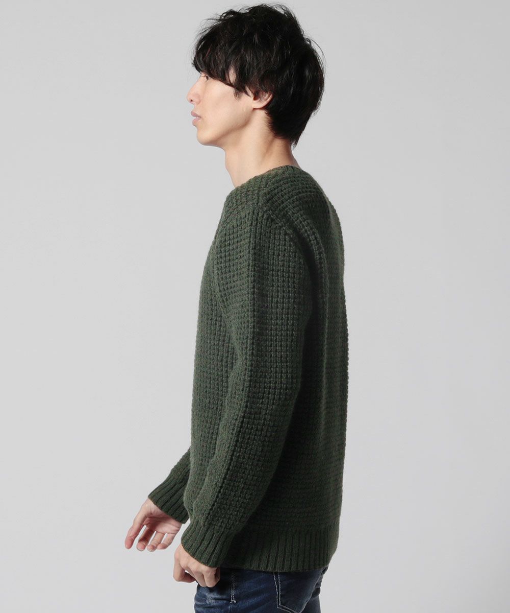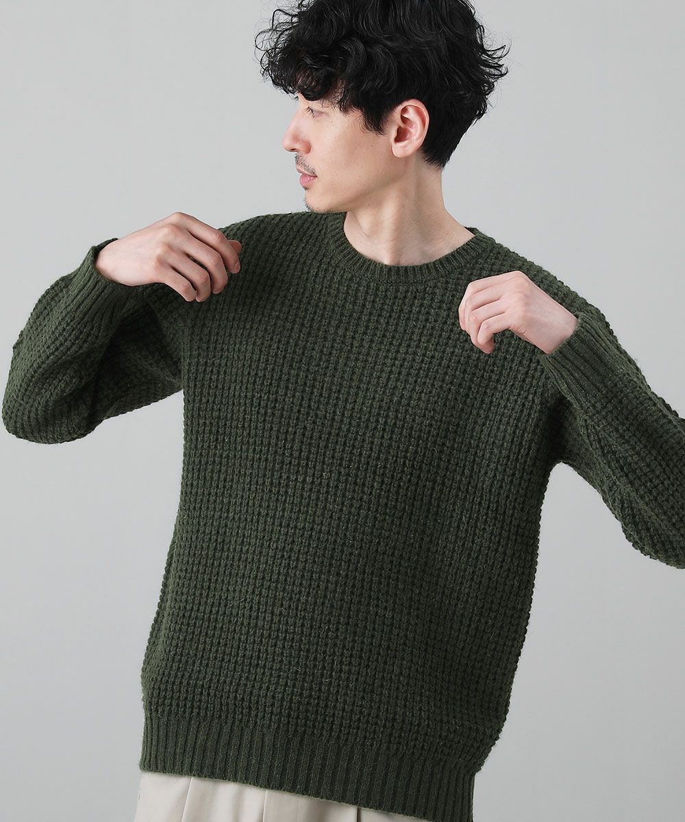 立体的で厚みが出るラーベン編みを採用しました。凸凹とした豊かな表情で存在感を放つ編地です。素材には80%ものウールを入れております。さらに、ウールだけでなく弾力性のあるナイロンを混紡することで、柔らかく動きやすい編地に仕上げました。着心地も良く、真冬でも頼れるほどの圧倒的な保温性を発揮してくれるニットとなっております。