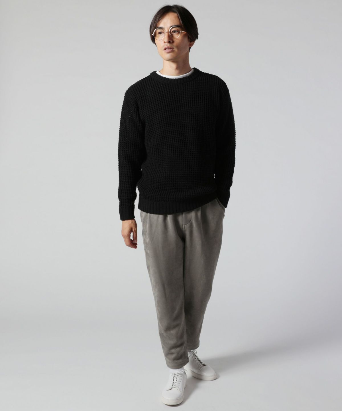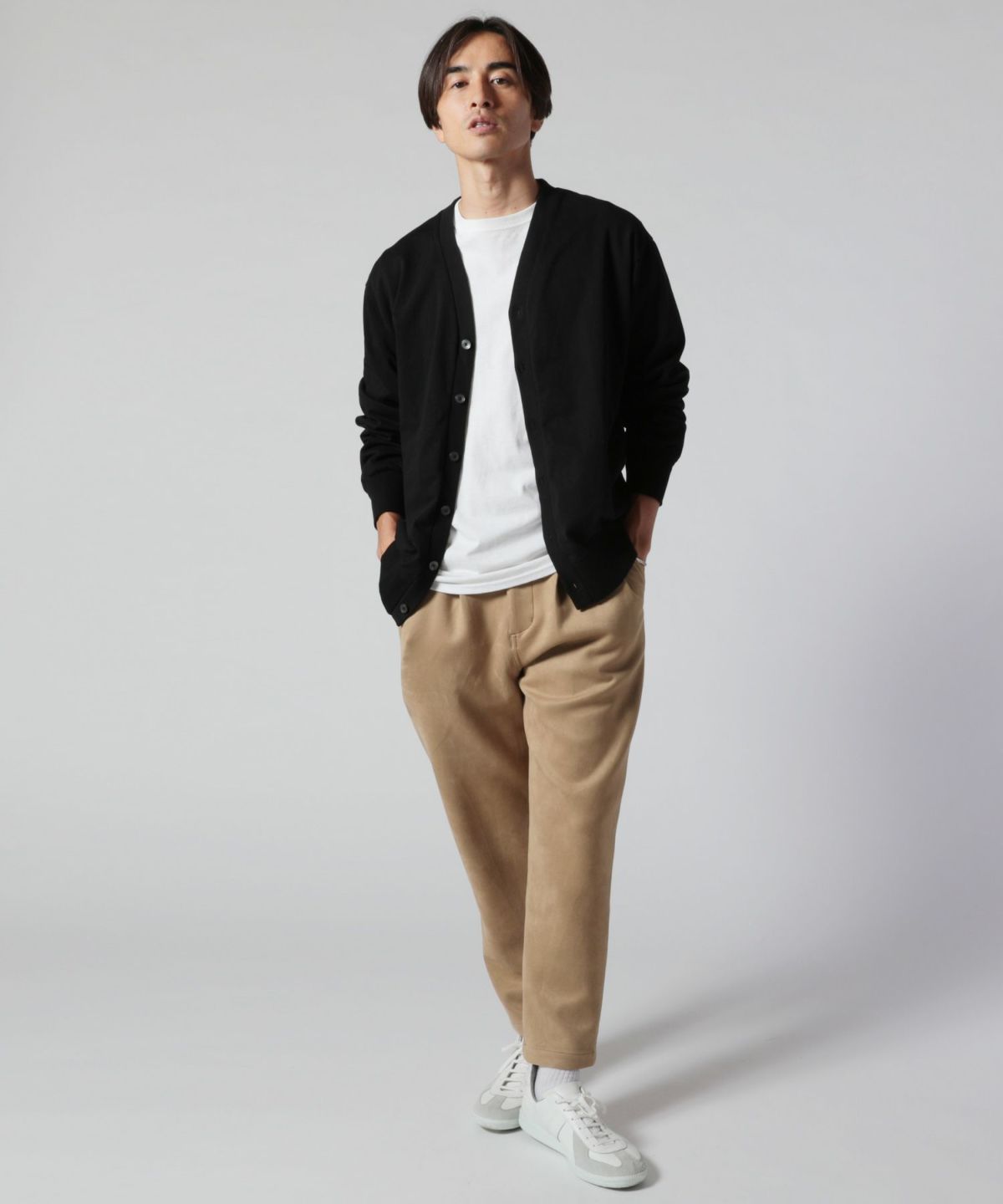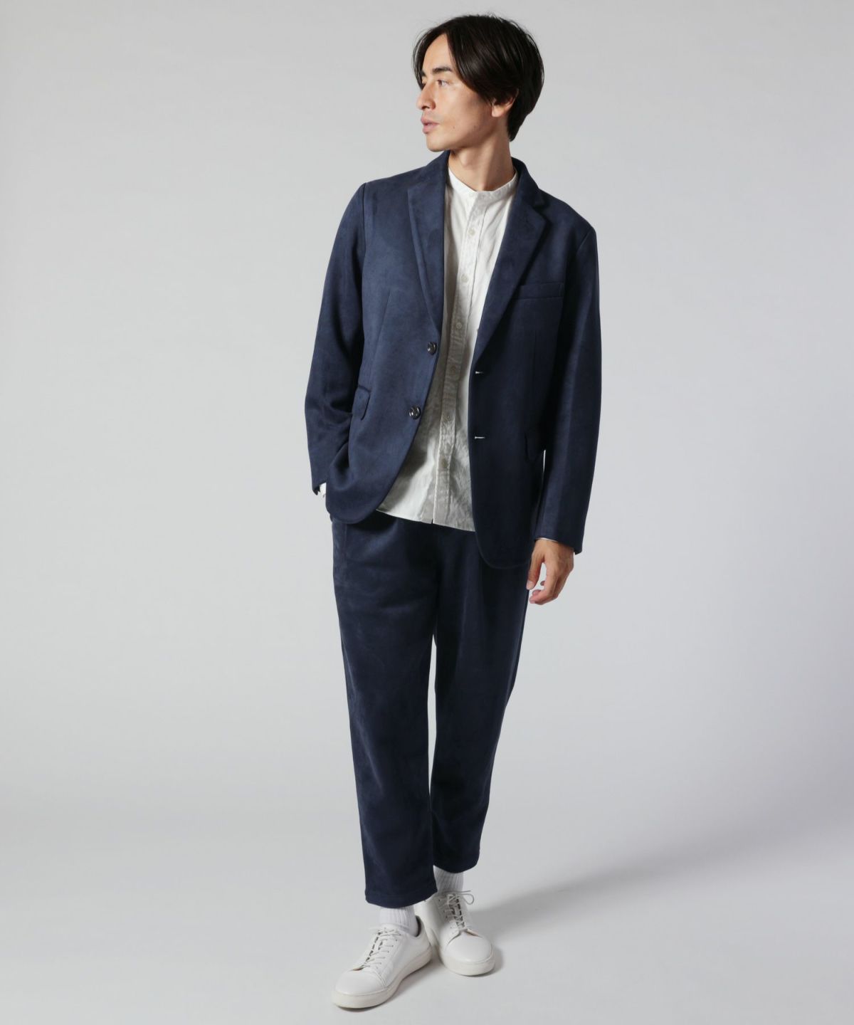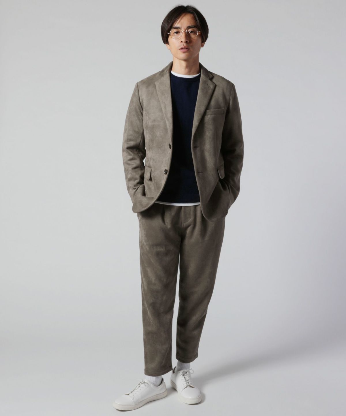 と上下揃えて着用すれば、簡単にお洒落なセットアップコーデが完成します。スーツ地のセットアップコーデとは印象の異なる、落ち着いた大人の着こなしをぜひお楽しみください。