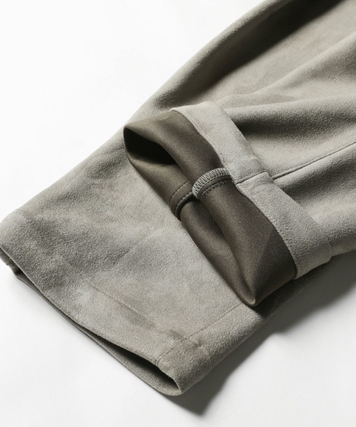 生地には高級感漂うしっとりとした質感のスエード調を採用。起毛した生地表面はほのかな光沢感があり、上品な印象を生み出しています。今回はダンボールに似た2層構造を採用し、空気を蓄えられるつくりによって高い保温性を発揮する一着に仕上げました。ストレッチ性にも富み、膝を曲げても突っ張らず快適にお召しいただけます。
