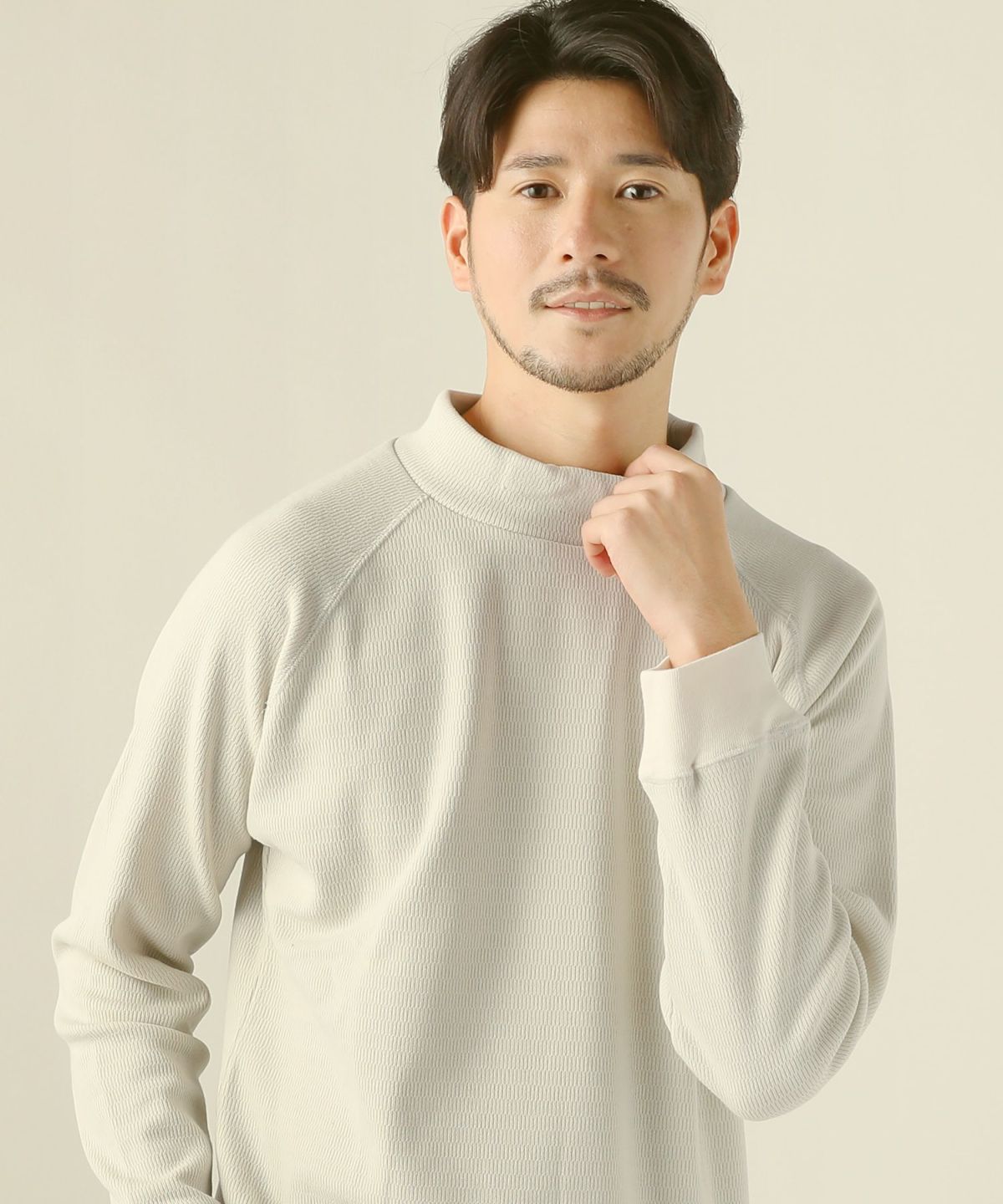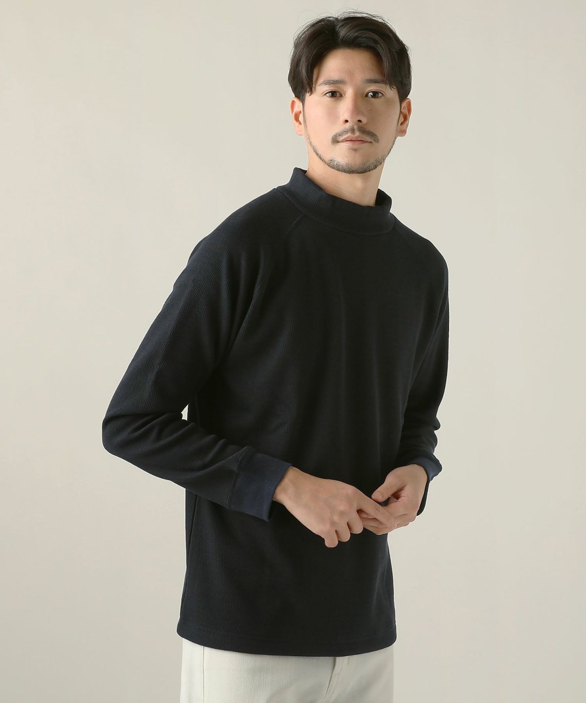 表面はハニカムサーマル組織のニット地となっております。カジュアルな印象を与えるハニカムサーマル地ですが、品の良い印象を演出するモックネックデザインと掛け合わせることにより、カジュアルにもキレイめにも合わせやすいアイテムへと仕上げました。