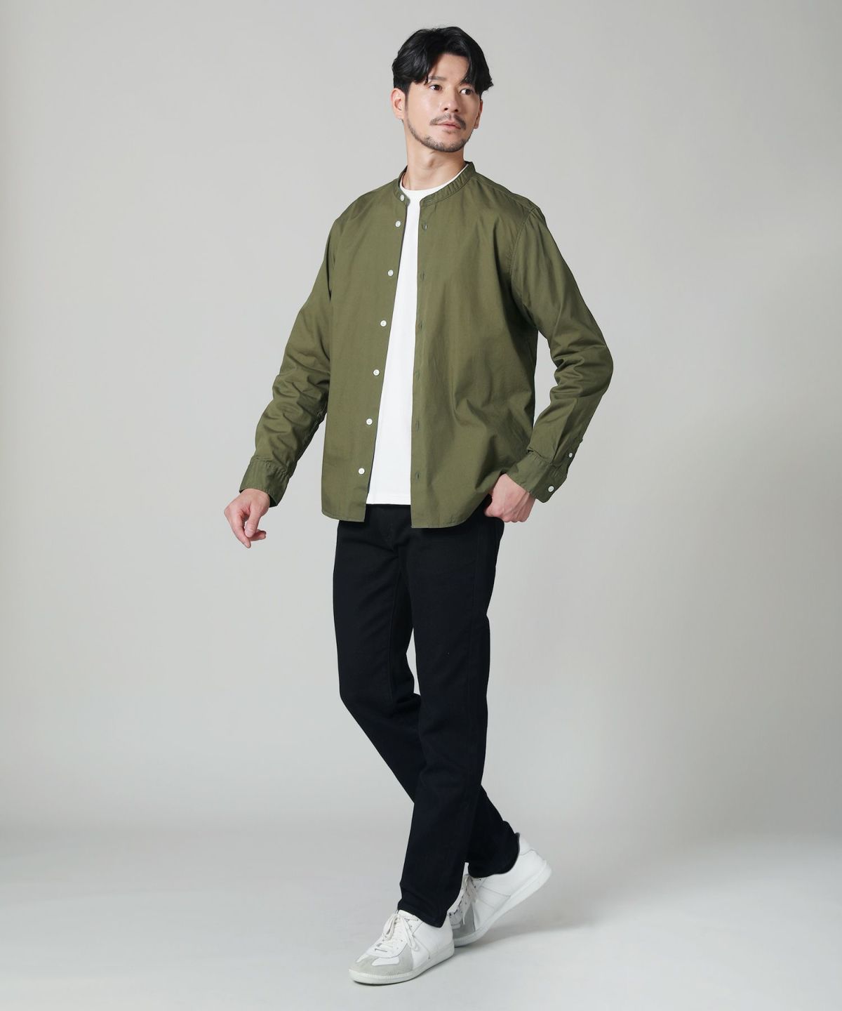 首元がスッキリとして見えるバンドカラーシャツは、コーディネートにこなれ感をプラスし、カジュアルさの中に上品さを感じさせてくれるアイテム。高い着回し力を持ち、単体での着用はもちろん、前ボタンを開けた羽織り使いからセーターやカーディガンのインナーとしても重宝します。夏の冷房対策から、秋・冬・春先まで、着こなしを変えながらオールシーズンご着用いただける一着です。